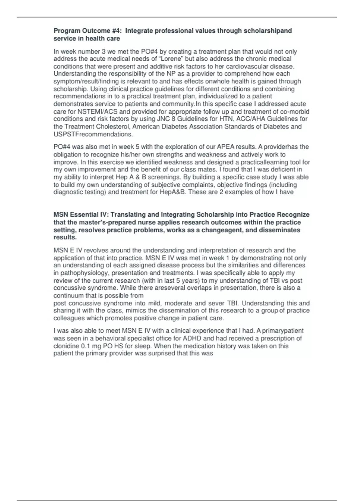 NR603 Week 8 Reflection Program Outcome #4: Integrate professional values through scholarship and service in health care In week number 3 we met the PO#4 by creating a treatment plan that would not only address the acute medical needs of “Lorene” but also address the chronic medical conditions that were present and additive risk factors to her cardiovascular disease. Understanding the responsibility of the NP as a provider to comprehend how each symptom/result/finding is relevant to and has effects on whole health is gained through scholarship. Using clinical practice guidelines for different conditions and combining recommendations in to a practical treatment plan, individualized to a patient demonstrates service to patients and community. In this specific case I addressed acute care for NSTEMI/ACS and provided for appropriate follow up and treatment of co-morbid conditions and risk factors by using JNC 8 Guidelines for HTN, ACC/AHA Guidelines for the Treatment Cholesterol, American Diabetes Association Standards of Diabetes and USPSTF recommendations. PO#4 was also met in week 5 with the exploration of our APEA results. A provider has the obligation to recognize his/her own strengths and weakness and actively work to improve. In this exercise we identified weakness and designed a practical learning tool for my own improvement and the benefit of our class mates. I found that I was deficient in my ability to interpret Hep A & B screenings. By building a specific case study I was able to build my own understanding of subjective complaints, objective findings (including diagnostic testing) and treatment for Hep A&B. These are 2 examples of how I have MSN Essential IV: Translating and Integrating Scholarship into Practice Recognize that the master’s-prepared nurse applies research outcomes within the practice setting, resolves practice problems, works as a change agent, and disseminates results.
