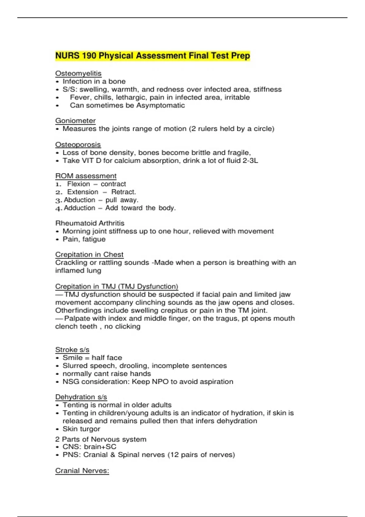 NURS 190 Physical Assessment Final Test Prep NURS 190 Physical Assessment Final Test Prep Osteomyelitis • Infection in a bone • S/S: swelling, warmth, and redness over infected area, stiffness • Fever, chills, lethargic, pain in infected area, irritable • Can sometimes be Asymptomatic Goniometer • Measures the joints range of motion (2 rulers held by a circle) Osteoporosis • Loss of bone density, bones become brittle and fragile, • Take VIT D for calcium absorption, drink a lot of fluid 2-3L ROM assessment 1. Flexion – contract 2. Extension – Retract. 3. Abduction – pull away. 4. Adduction – Add toward the body. Rheumatoid Arthritis • Morning joint stiffness up to one hour, relieved with movement • Pain, fatigue Crepitation in Chest Crackling or rattling sounds -Made when a person is breathing with an inflamed lung Crepitation in TMJ (TMJ Dysfunction) — TMJ dysfunction should be suspected if facial pain and limited jaw movement accompany clinching sounds as the jaw opens and closes. Other findings include swelling crepitus or pain in the TM joint. — Palpate with index and middle finger, on the tragus, pt opens mouth clench teeth , no clicking