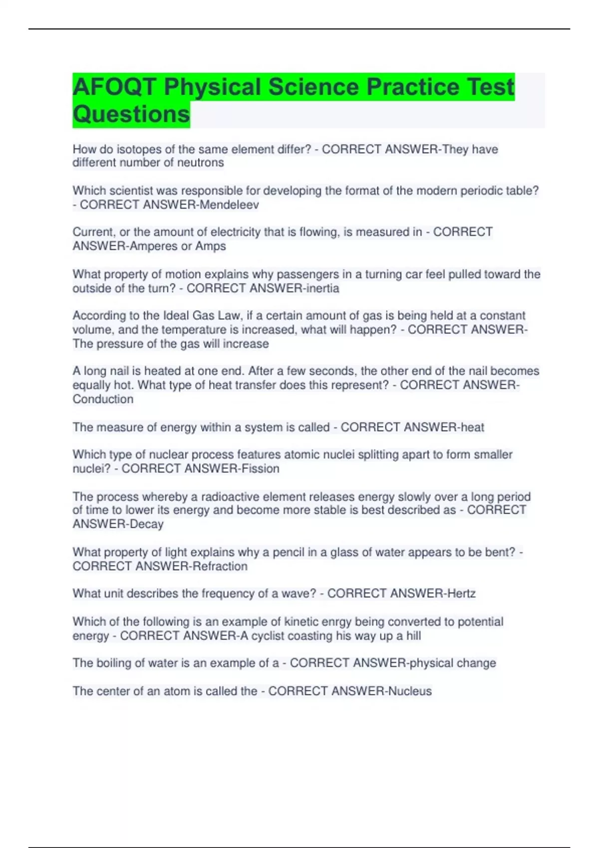 AFOQT Physical Science Practice Test Questions How do isotopes of the same element differ? - CORRECT ANSWER-They have different number of neutrons Which scientist was responsible for developing the format of the modern periodic table? - CORRECT ANSWER-Mendeleev Current, or the amount of electricity that is flowing, is measured in - CORRECT ANSWER-Amperes or Amps What property of motion explains why passengers in a turning car feel pulled toward the outside of the turn? - CORRECT ANSWER-inertia According to the Ideal Gas Law, if a certain amount of gas is being held at a constant volume, and the temperature is increased, what will happen? - CORRECT ANSWER-The pressure of the gas will increase A long nail is heated at one end. After a few seconds, the other end of the nail becomes equally hot. What type of heat transfer does this represent? - CORRECT ANSWER-Conduction The measure of energy within a system is called - CORRECT ANSWER-heat Which type of nuclear process features atomic nuclei splitting apart to form smaller nuclei? - CORRECT ANSWER-Fission The process whereby a radioactive element releases energy slowly over a long period of time to lower its energy and become more stable is best described as - CORRECT ANSWER-Decay What property of light explains why a pencil in a glass of water appears to be bent? - CORRECT ANSWER-Refraction What unit describes the frequency of a wave? - CORRECT ANSWER-Hertz Which of the following is an example of kinetic enrgy being converted to potential energy - CORRECT ANSWER-A cyclist coasting his way up a hill The boiling of water is an example of a - CORRECT ANSWER-physical change The center of an atom is called the - CORRECT ANSWER-Nucleus When a solid is heated and transforms directly to the gaseuous phases, this process is called - CORRECT ANSWER-sublimation The density of a material refers to its - CORRECT ANSWER-Mass per unit volume The precision of a set of experimentally obtianed data points refers to - CORRECT ANSWER-How close the data points are to the mean of the data A solar eclipse can only occur if - CORRECT ANSWER-the moon is between the earth and sun What wave characteristic is related to the loudness of a sound - CORRECT ANSWER-Amplitude