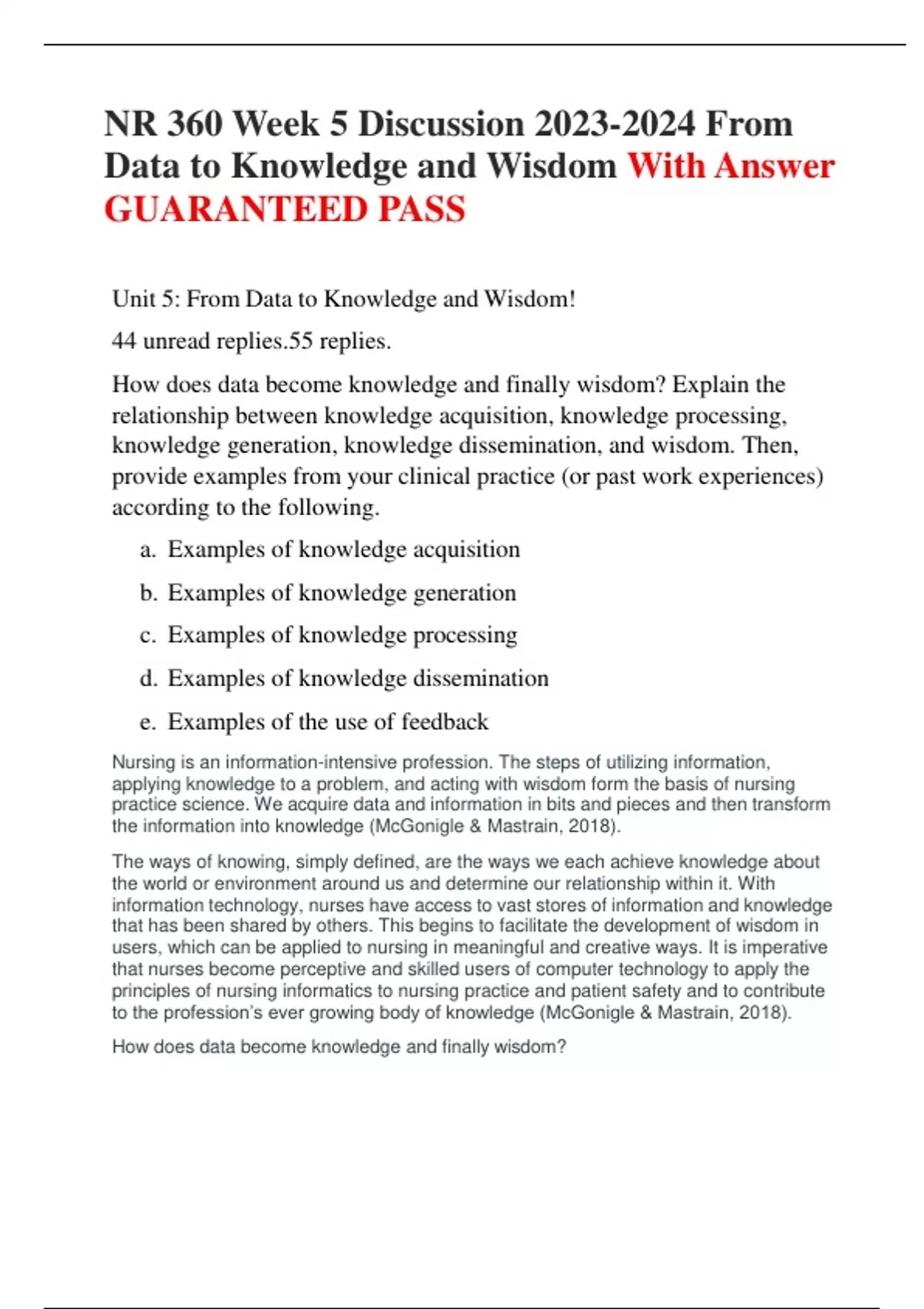 NR 360 Week 5 Discussion From Data to Knowledge and Wisdom With Answer GUARANTEED PASS How does data become knowledge and finally wisdom? Explain the relationship between knowledge acquisition, knowledge processing, knowledge generation, knowledge dissemination, and wisdom. Then, provide examples from your clinical p