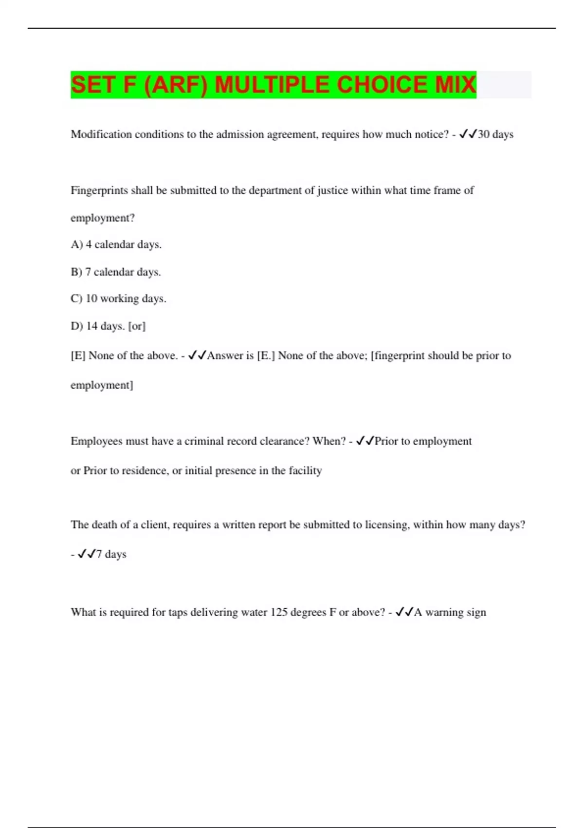 Modification conditions to the admission agreement, requires how much notice? - 30 days Fingerprints shall be submitted to the department of justice within what time frame of employment? A) 4 calendar days. B) 7 calendar days. C) 10 working days. D) 14 days. [or] [E] None of the above. - Answer is [E.] None of the above; [fingerprint should be prior to employment] Employees must have a criminal record clearance? When? - Prior to employment or Prior to residence, or initial presence in the facility The death of a client, requires a written report be submitted to licensing, within how many days? - 7 days What is required for taps delivering water 125 degrees F or above? - A warning sign