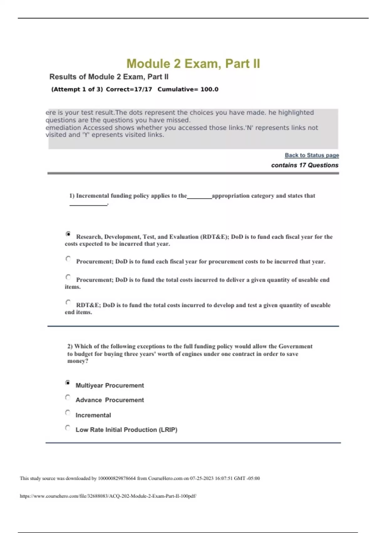 Module 2 Exam, Part II Results of Module 2 Exam, Part II (Attempt 1 of 3) Correct=17/17 Cumulative= 100.0 Back to Status page contains 17 Questions 1) Incremental funding policy applies to the appropriation category and states that . Research, Development, Test, and Evaluation (RDT&E); DoD is to fund each fiscal year for the costs expected to be incurred that year. Procurement; DoD is to fund each fiscal year for procurement costs to be incurred that year. Procurement; DoD is to fund the total costs incurred to deliver a given quantity of useable end items. RDT&E; DoD is to fund the total costs incurred to develop and test a given quantity of useable end items. 2) Which of the following exceptions to the full funding policy would allow the Government to budget for buying three years' worth of engines under one contract in order to save money? Multiyear Procurement Advance Procurement Incremental Low Rate Initial Production (LRIP) 3) Financial managers use escalation to consider the effects of inflation on an acquisition program by applying: Compound and composite indices to program cost estimates Inflation factors to actual costs incurred by the contractor Incremental funding policy to Research, Development, Test, and Evaluation (RDT&E) appropriations requested in the Program Objectives Memorandum (POM) Full funding policy to defense procurement appropriations requested in the budget 4) The primary unit of data in the Future Years Defense Program (FYDP) and normally the smallest aggregation of resources controlled by the office of the Secretary of Defense (OSD) is the . Program Element Defense Appropriation Item .......................................continued........................................................
