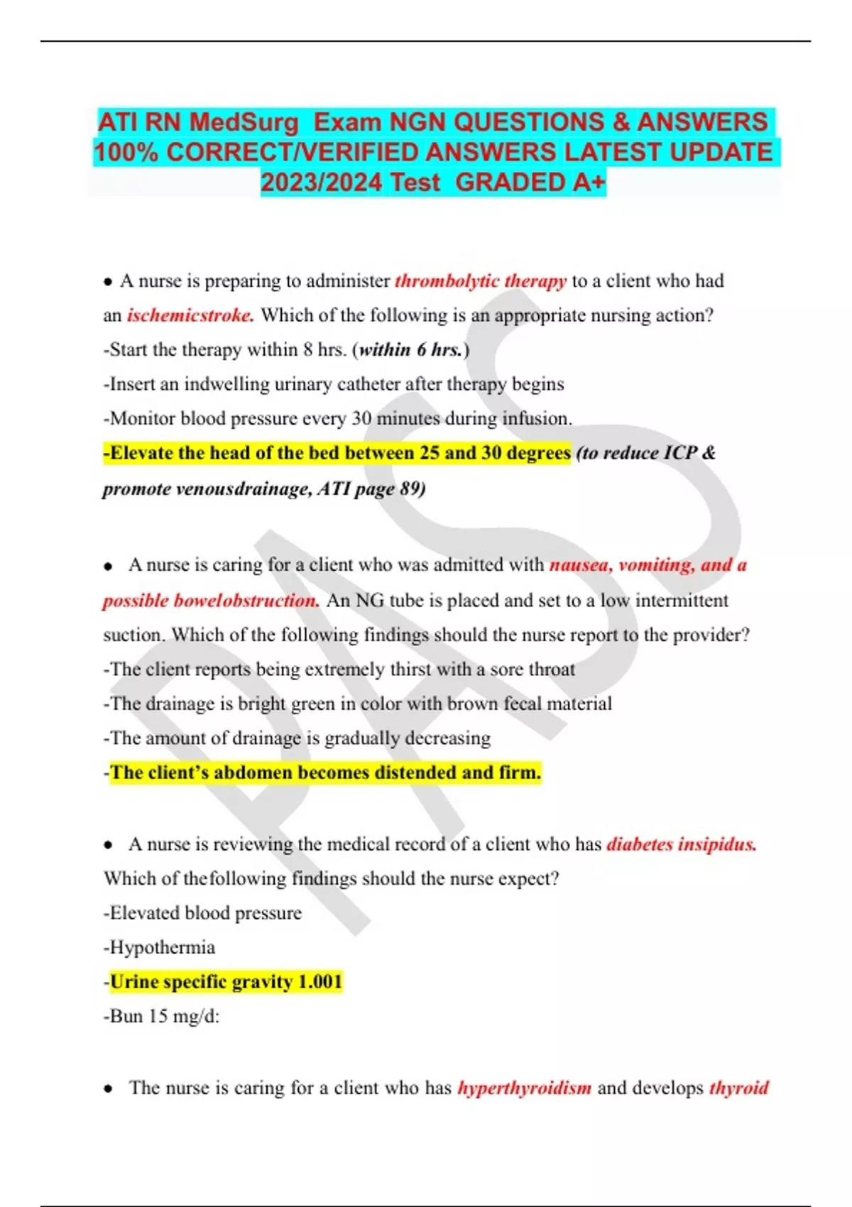 ATI RN MedSurg Exam NGN QUESTIONS & ANSWERS 100% CORRECT/VERIFIED ANSWERS LATEST UPDATE 2023/2024 Test GRADED A+ A nurse is preparing to administer thrombolytic therapy to a client who had an ischemic stroke. Which of the following is an appropriate nursing action? -Start the therapy within 8 hrs. (within 6 hrs.) -Insert an indwelling urinary catheter after therapy begins -Monitor blood pressure every 30 minutes during infusion. -Elevate the head of the bed between 25 and 30 degrees (to reduce ICP & promote venous drainage, ATI page 89) A nurse is caring for a client who was admitted with nausea, vomiting, and a possible bowel obstruction. An NG tube is placed and set to a low intermittent suction. Which of the following findings should the nurse report to the provider? -The client reports being extremely thirst with a sore throat -The drainage is bright green in color with brown fecal material -The amount of drainage is gradually decreasing -The client’s abdomen becomes distended and firm. A nurse is reviewing the medical record of a client who has diabetes insipidus. Which of the following findings should the nurse expect? -Elevated blood pressure -Hypothermia -Urine specific gravity 1.001 -Bun 15 mg/d: The nurse is caring for a client who has hyperthyroidism and develops thyroid storm. Which of the following instructions should the nurse give to the client regarding management of thyroid storm? -You will need to begin taking an ACE inhibition medication -You will need a pacemaker to increase your heart rate -You will need a cooling blanket to lower your body temperature -You will need additional thyroid supplementation The nurse is reviewing the medical record of a client who has acute gout. The nurse should expect an increase in which of the following laboratory results? -Uric acid -Intrinsic factor -Creatinine kinase -Chloride level A nurse is preparing to administer peritoneal dialysis to a client. Which of the following actions should the nurse take? -Use clean technique to access the catheter -Chill the dialysate before administration -Hang the drainage bag below the client’s abdomen -Place the client in high-Fowler’s position. A nurse in the emergency department is caring for a client who has deep partial thickness burns over 30% of his body, including his upper chest and abdomen. Which of the following actions is the nurse priority? -Insert an 18-gauge IV catheter -Administer tetanus toxoid -Check the clients mouth for black particles -Remove the clients burned clothing.