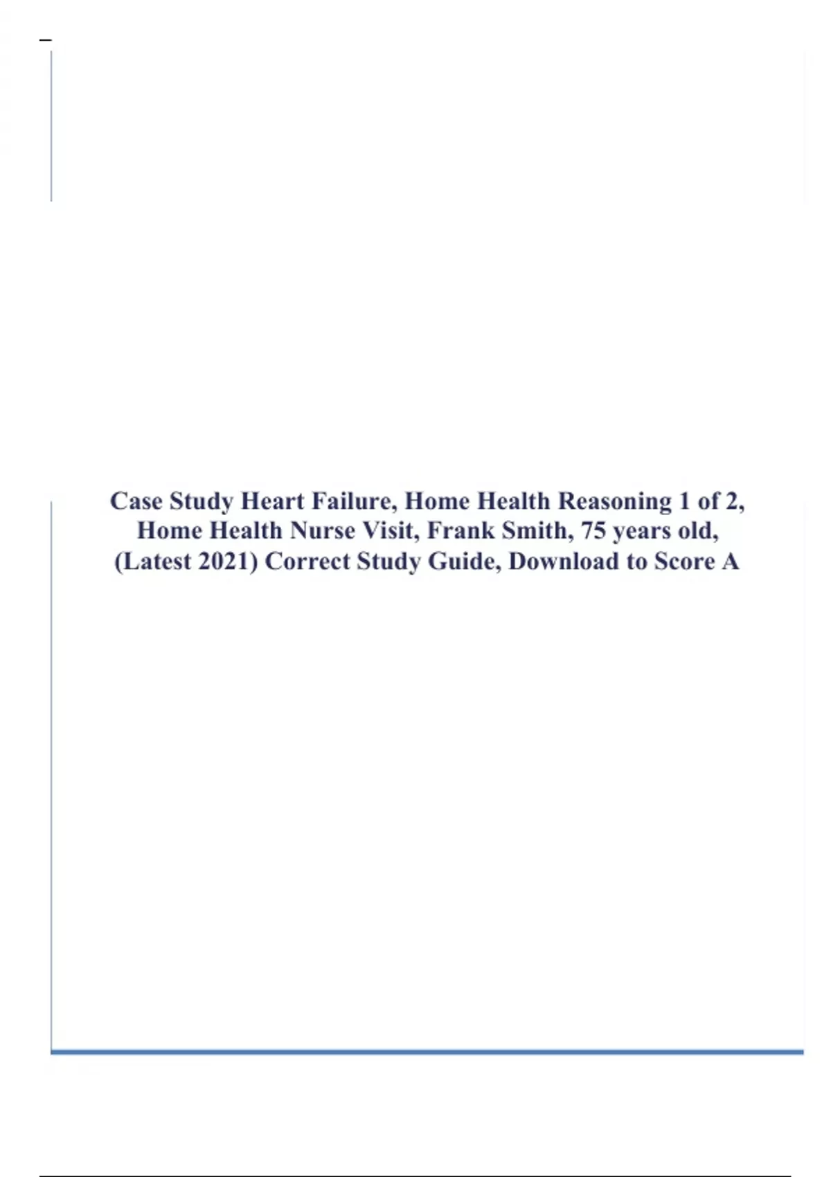 Case Study Heart Failure, Home Health Reasoning 1 of 2, Home Health Nurse Visit, Frank Smith, 75 years old, (Latest 2021) Correct Study Guide, Download to Score A