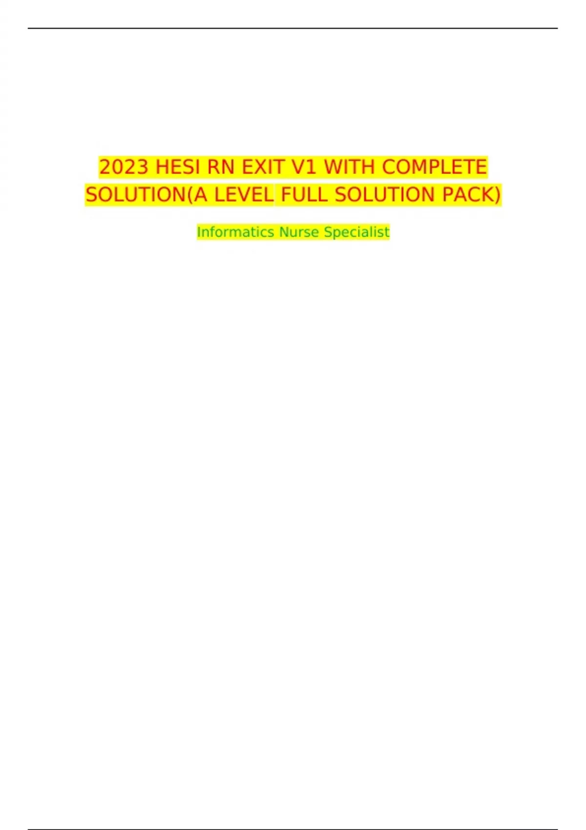 2023 HESI RN EXIT V1 WITH COMPLETE SOLUTION(A LEVEL FULL SOLUTION PACK) Informatics Nurse Specialist 2023 HESI EXIT V1 1. Which information is a priority for the RN to reinforce to an older client after intravenous pylegraphy? A) Eat a light diet for the rest of the day B) Rest for the next 24 hours since the preparation and the test is tiring. C) During waking hours drink at least 1 8-ounce glass of fluid every hour for the next 2 days D) Measure the urine output for the next day and immediately notify the health care provider if it should decrease. 2. A client has altered renal function and is being treated at home. The nurse recognizes that the most accurate indicator of fluid balance during the weekly visits is A) difference in the intake and output B) changes in the mucous membranes C) skin turgor D) weekly weight 3. A client has been diagnosed with Zollinger-Ellison syndrome.Which information is most important for the nurse to reinforce with the client? A) It is a condition in which one or more tumors called gastrinomas form in the pancreas or in the upper part of the small intestine (duodenum) B) It is critical to report promptly to your health care provider any findings of peptic ulcers c)Treatment consists of medications to reduce acid and heal any peptic ulcers and, if possible, surgery to remove any tumors D)With the average age at diagnosis at 50 years the peptic ulcers may occur at unusual 3 4. A primigravida in the third trimester is hospitalized for preeclampsia. The nurse determines that the client’s blood pressure is increasing. Which action should the nurse take first? A) Check the protein level in urine B) Have the client turn to the left side C) Take the temperature D) Monitor the urine output 5. The nurse is caring for a client in atrial fibrillation. The atrial heart rate is 250 and the ventricular rate is controlled at 75. Which of the following findings is cause for the most concern? A) Diminished bowel sounds B) Loss of appetite C) A cold, pale lower leg D) Tachypnea ..................................................continued.........................................