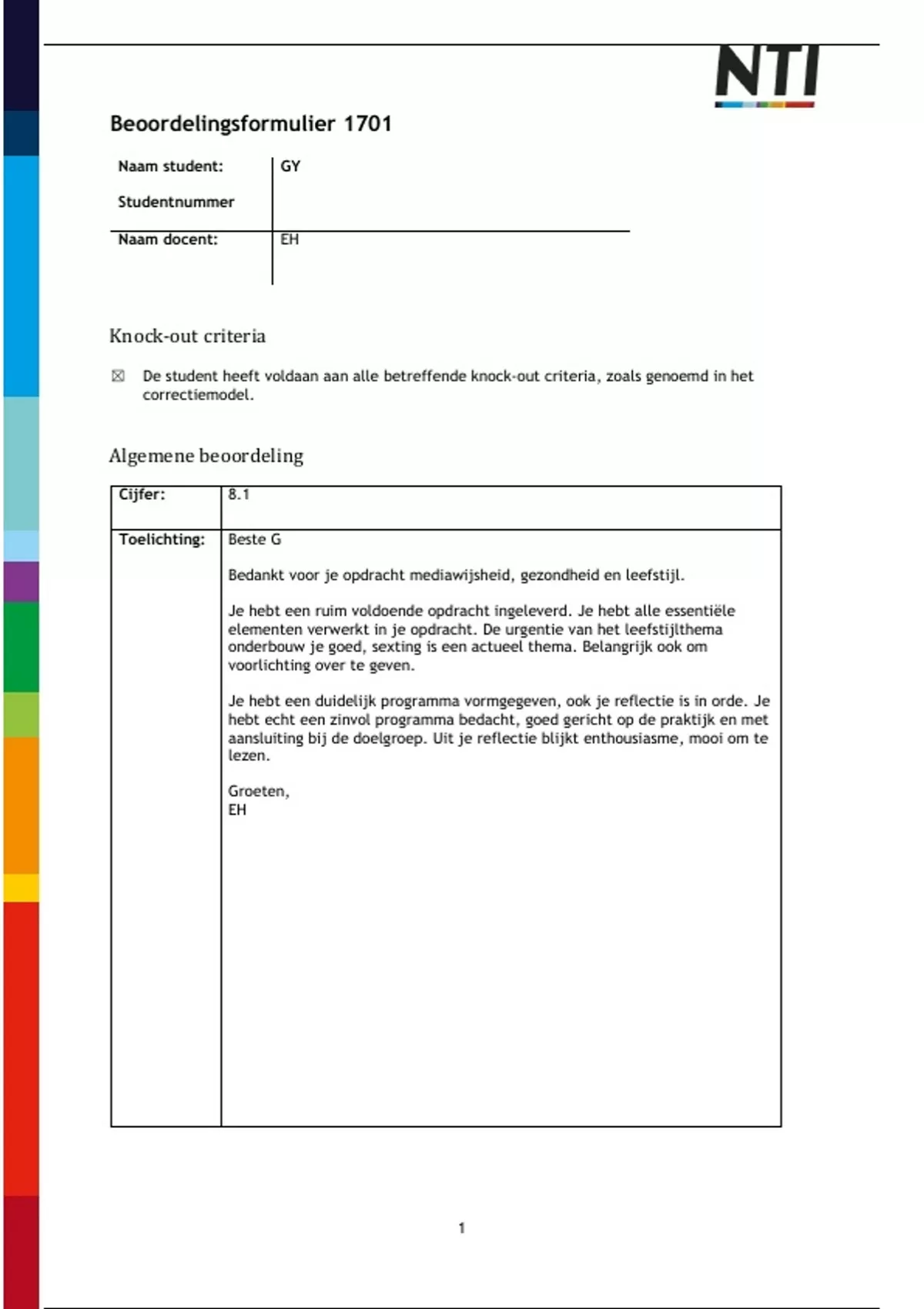 Beoordelingsformulier van de module Mediawijsheid, gezondheid en leefstijl jeugd. Beoordeeld met een 8.1
