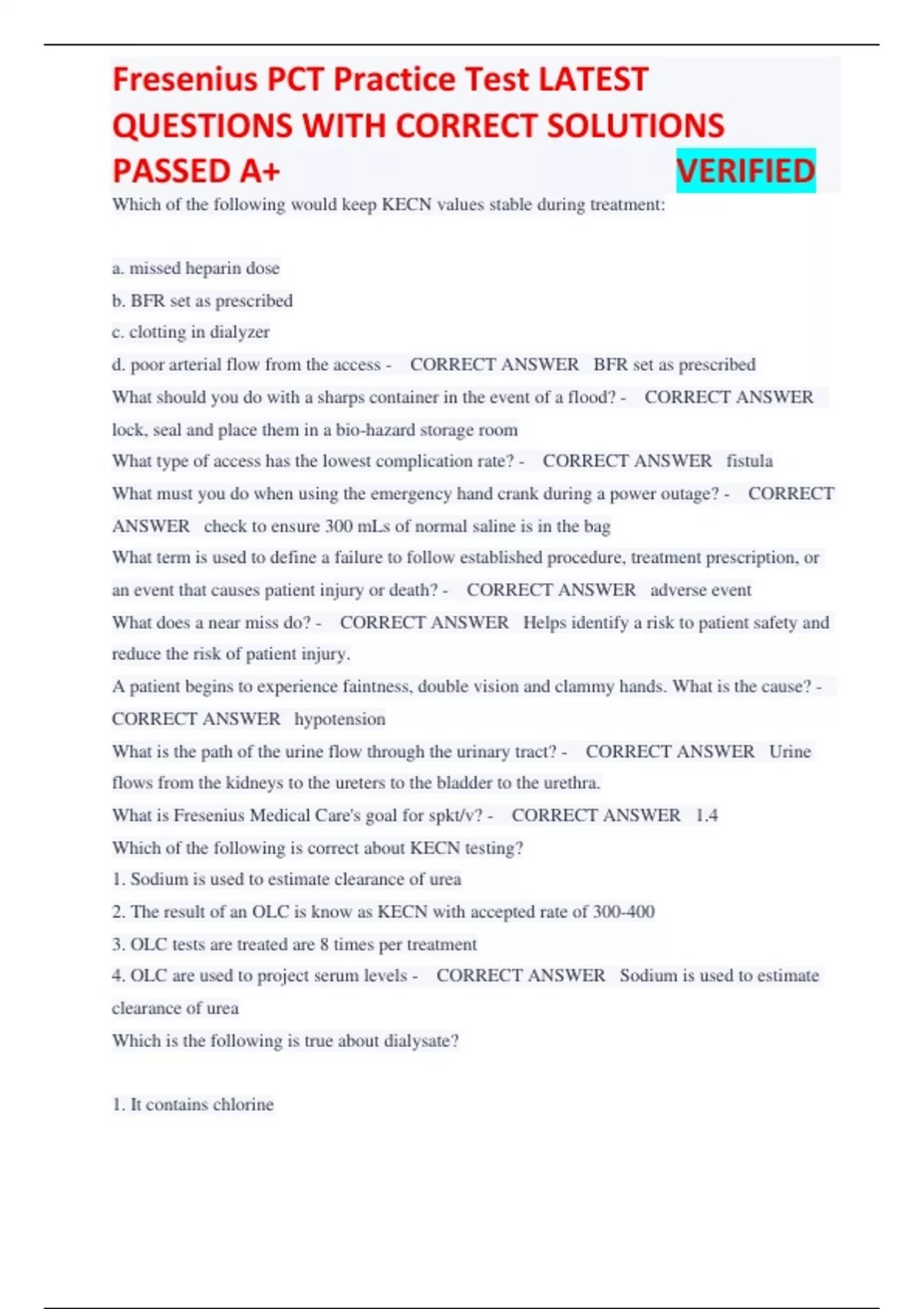 Which of the following would keep KECN values stable during treatment: a. missed heparin dose b. BFR set as prescribed c. clotting in dialyzer d. poor arterial flow from the access - CORRECT ANSWER BFR set as prescribed What should you do with a sharps container in the event of a flood? - CORRECT ANSWER lock, seal and place them in a bio-hazard storage room What type of access has the lowest complication rate? - CORRECT ANSWER fistula What must you do when using the emergency hand crank during a power outage? - CORRECT ANSWER check to ensure 300 mLs of normal saline is in the bag What term is used to define a failure to follow established procedure, treatment prescription, or an event that causes patient injury or death? - CORRECT ANSWER adverse event What does a near miss do? - CORRECT ANSWER Helps identify a risk to patient safety and reduce the risk of patient injury.