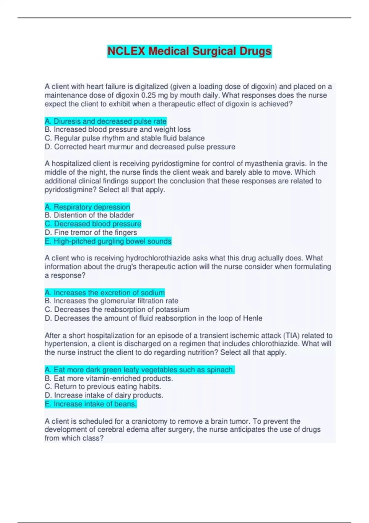 NCLEX Medical Surgical Drugs - Questions and Answers A client with heart failure is digitalized (given a loading dose of digoxin) and placed on a maintenance dose of digoxin 0.25 mg by mouth daily. What responses does the nurse expect the client to exhibit when a therapeutic effect of digoxin is achieved? A. Diuresis and decreased pulse rate B. Increased blood pressure and weight loss C. Regular pulse rhythm and stable fluid balance D. Corrected heart murmur and decreased pulse pressure A hospitalized client is receiving pyridostigmine for control of myasthenia gravis. In the middle of the night, the nurse finds the client weak and barely able to move. Which additional clinical findings support the conclusion that these responses are related to pyridostigmine? Select all that apply. A. Respiratory depression B. Distention of the bladder C. Decreased blood pressure D. Fine tremor of the fingers E. High-pitched gurgling bowel sounds A client who is receiving hydrochlorothiazide asks what this drug actually does. What information about the drug's therapeutic action will the nurse consider when formulating a response? A. Increases the excretion of sodium B. Increases the glomerular filtration rate C. Decreases the reabsorption of potassium D. Decreases the amount of fluid reabsorption in the loop of Henle After a short hospitalization for an episode of a transient ischemic attack (TIA) related to hypertension, a client is discharged on a regimen that includes chlorothiazide. What will the nurse instruct the client to do regarding nutrition? Select all that apply. A. Eat more dark green leafy vegetables such as spinach. B. Eat more vitamin-enriched products. C. Return to previous eating habits. D. Increase intake of dairy products. E. Increase intake of beans. A client is scheduled for a craniotomy to remove a brain tumor. To prevent the development of cerebral edema after surgery, the nurse anticipates the use of drugs from which class? A. Steroids B. Diuretics C. Anticonvulsants D. Antihypertensives A client with arthritis increases the dose of ibuprofen to abate joint discomfort. After several weeks the client becomes increasingly weak. The client is admitted to the hospital and is diagnosed with severe anemia. What findings does the nurse expect to identify when performing an admission assessment? Select all that apply. A. Melena B. Tachycardia C. Constipation D. Clay-colored stools E. Painful bowel movements The nurse is providing postoperative care for a client who has received a prescription for nalbuphine for pain. What side effects or adverse reactions does the nurse anticipate after administering this medication? Select all that apply. A. Nausea B. Oliguria C. Sedation D. Dry mouth E. Flushed skin F. Orthostatic hypotension A nurse is teaching a client who is taking a loop diuretic about foods that are high in potassium. Which foods should the nurse emphasize? Select all that apply. A. Bananas B. Apricots C. Roasted chicken D. Macaroni and cheese E. Baked potatoes with skins Twenty minutes after the start of an intravenous (IV) vancomycin infusion, the client appears flushed and complains of palpitations. What action should the nurse take? A. Stop the infusion; the client is having an allergic reaction. B. Continue to monitor the client; this is an expected reaction. C. Contact the primary healthcare provider to obtain a prescription to decrease the infusion rate. D. Contact the primary healthcare provider to obtain a prescription for an antianxiety medication.