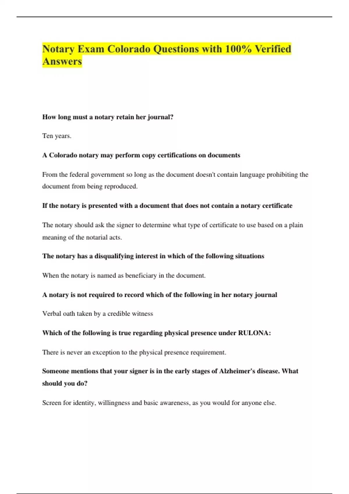 Notary Exam Colorado Questions with 100% Verified Answers