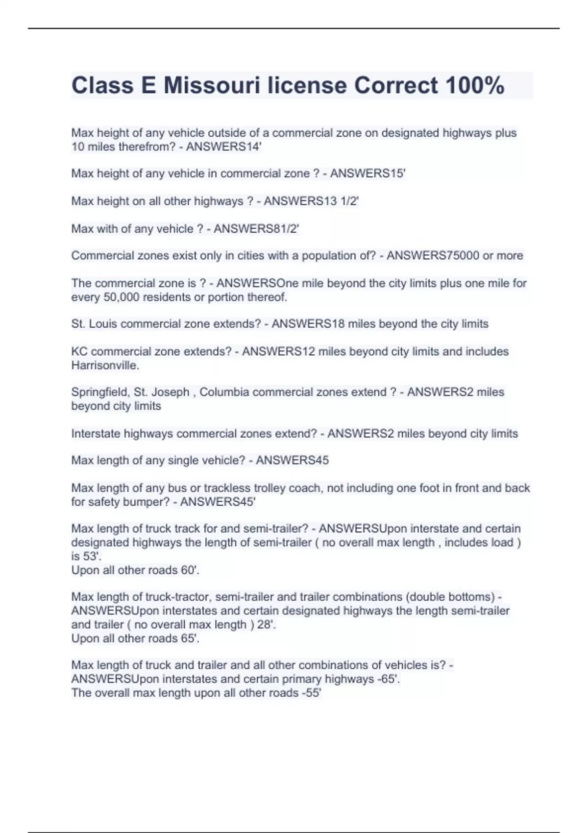 Max height of any vehicle outside of a commercial zone on designated highways plus 10 miles therefrom? - ANSWERS14' Max height of any vehicle in commercial zone ? - ANSWERS15' Max height on all other highways ? - ANSWERS13 1/2' Max with of any vehicle ? - ANSWERS81/2' Commercial zones exist only in cities with a population of? - ANSWERS75000 or more The commercial zone is ? - ANSWERSOne mile beyond the city limits plus one mile for every 50,000 residents or portion thereof. St. Louis commercial zone extends? - ANSWERS18 miles beyond the city limits KC commercial zone extends? - ANSWERS12 miles beyond city limits and includes Harrisonville. Springfield, St. Joseph , Columbia commercial zones extend ? - ANSWERS2 miles