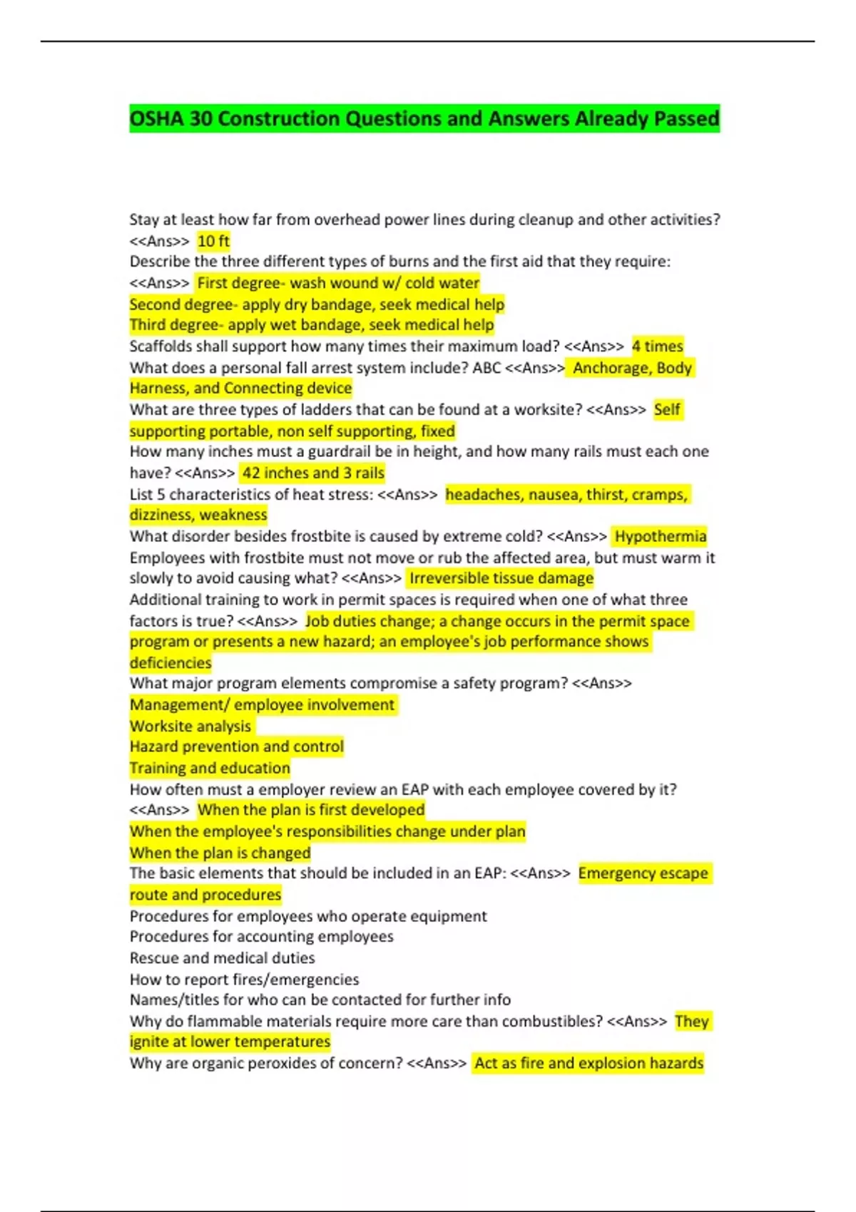 Stay at least how far from overhead power lines during cleanup and other activities? <<Ans>> 10 ft Describe the three different types of burns and the first aid that they require: <<Ans>> First degree- wash wound w/ cold water Second degree- apply dry bandage, seek medical help Third degree- apply wet bandage, seek medical help Scaffolds shall support how many times their maximum load? <<Ans>> 4 times What does a personal fall arrest system include? ABC <<Ans>> Anchorage, Body Harness, and Connecting device What are three types of ladders that can be found at a worksite? <<Ans>> Self supporting portable, non self supporting, fixed How many inches must a guardrail be in height, and how many rails must each one have? <<Ans>> 42 inches and 3 rails List 5 characteristics of heat stress: <<Ans>> headaches, nausea, thirst, cramps, dizziness, weakness What disorder besides frostbite is caused by extreme cold? <<Ans>> Hypothermia Employees with frostbite must not move or rub the affected area, but must warm it slowly to avoid causing what? <<Ans>> Irreversible tissue damage Additional training to work in permit spaces is required when one of what three factors is true? <<Ans>> Job duties change; a change occurs in the permit space program or presents a new hazard; an employee's job performance shows deficiencies What major program elements compromise a safety program? <<Ans>> Management/ employee involvement Worksite analysis Hazard prevention and control Training and education How often must a employer review an EAP with each employee covered by it? <<Ans>> When the plan is first developed When the employee's responsibilities change under plan When the plan is changed The basic elements that should be included in an EAP: <<Ans>> Emergency escape route and procedures Procedures for employees who operate equipment Procedures for accounting employees Rescue and medical duties How to report fires/emergencies Names/titles for who can be contacted for further info Why do flammable materials require more care than combustibles? <<Ans>> They ignite at lower temperatures Why are organic peroxides of concern? <<Ans>> Act as fire and explosion hazards What is an oxidizer? <<Ans>> A chemical that initiates combustion in other materials What info is included on labels? <<Ans>> Complete chemical name Warning statement Manufacturer's name, address, and contact info What hazards do the colors of a label indicate? <<Ans>> Blue= health Red= fire Yellow= reactivity White= other Health hazards are <<Ans>> acute or chronic Four classifications of Asbestos <<Ans>> I- most hazardous class (removal of insulation) II- removal thru flooring/roofing materials III- jobs where repairs are made around asbestos IV- custodial jobs where cleanup of asbestos occurs List 8 common symptoms of chronic overexposure to lead: <<Ans>> loss of appetite; constipation; nausea; headache; weakness; dizziness; tremors; excessive tiredness; anxiety What must PSM training include? <<Ans>> toxicity; PEL; physical data; reactivity data; corrosive data; thermal & chemical stability data; effects if mixed with other chemicals What must training documentation records include? <<Ans>> identity of employee; date of training; procedures/tests used PSM requirements apply to what equipment? <<Ans>> pressure vessels & storage tanks; piping systems; relief/vent systems; emergency shutdown systems; controls; pumps What 5 items must a investigation report include? <<Ans>> date of incident; date investigation began; description; factors that contributed; recommendations resulting from investigation Employee responsibilities involving PPE are what? <<Ans>> Inspecting and maintaining PPE Wear PPE properly Employers must provide PPE if what is true? <<Ans>> Hazards exist; the employer is unable to eliminate those hazards Name the basic hazard categories: <<Ans>> Impact penetration Compression Heat/cold harmful dust Light radiation biologic Name four work practice controls: <<Ans>> changing work habits; improving sanitation; demonstrating good hygiene; training Employees must know and understand what about PPE? <<Ans>> How to use it and its purpose PPE shall be free to the employee except for when? <<Ans>> Work shoes, everyday clothing, prescription eyewear Describe the different classes of hardhats: <<Ans>> Class C- construction, protects from impact made for comfort Class G- protects from impacts and up to 2,200 volts of electricity