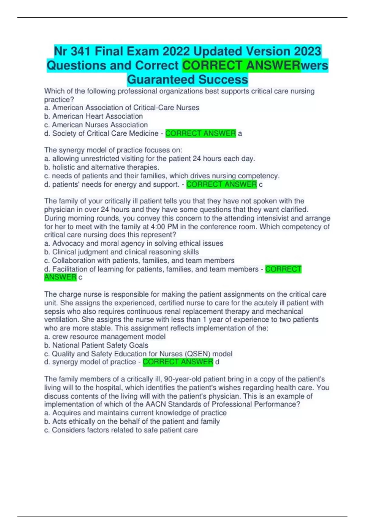 Nr 341 Final Exam 2022 Updated Version 2023 Questions and Correct Answers Guaranteed Success