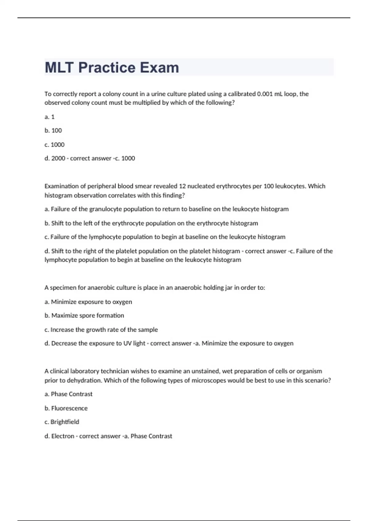 To correctly report a colony count in a urine culture plated using a calibrated 0.001 mL loop, the observed colony count must be multiplied by which of the following? a. 1 b. 100 c. 1000 d. 2000 c. 1000 Examination of peripheral blood smear revealed 12 nucleated erythrocytes per 100 leukocytes. Which histogram observation correlates with this finding? a. Failure of the granulocyte population to return to baseline on the leukocyte histogram b. Shift to the left of the erythrocyte population on the erythrocyte histogram c. Failure of the lymphocyte population to begin at baseline on the leukocyte histogram d. Shift to the right of the platelet population on the platelet histogram c. Failure of the lymphocyte population to begin at baseline on the leukocyte histogram A specimen for anaerobic culture is place in an anaerobic holding jar in order to: a. Minimize exposure to oxygen b. Maximize spore formation c. Increase the growth rate of the sample d. Decrease the exposure to UV light a. Minimize the exposure to oxygen A clinical laboratory technician wishes to examine an unstained, wet preparation of cells or organism prior to dehydration. Which of the following types of microscopes would be best to use in this scenario? a. Phase Contrast b. Fluorescence c. Brightfield d. Electron a. Phase Contrast An organism gives the following reactions: TSI and KIA alkaline slant over an acid butt, H2S positive ferments glucose. Based on these reactions, what is the most likely identification of the organism? a. Proteus mirabilis b. Esherichia coli c. Pseudomonas aeruginosa d. Salmonella sp. a. Proteus mirabilis A pregnant woman who has active syphillis and a RPR of 1:32 is being treated with penicillin. She gives birth to a baby boy. When the cord blood from the baby is tested, the RPR is 1:2. Based on the above data, the most likely interpretation is: a. The baby has congenital syphillis b. The baby does not have syphillis. A titer this low represents passive acquisition of the antibody from the mother c. The baby does not have syphillis. A titer this low represents a biological false positive d. No definitive conclusion can be made from this data. Further testing is necessary D.No definitive conclusion can be made from this data. Further testing is necessary