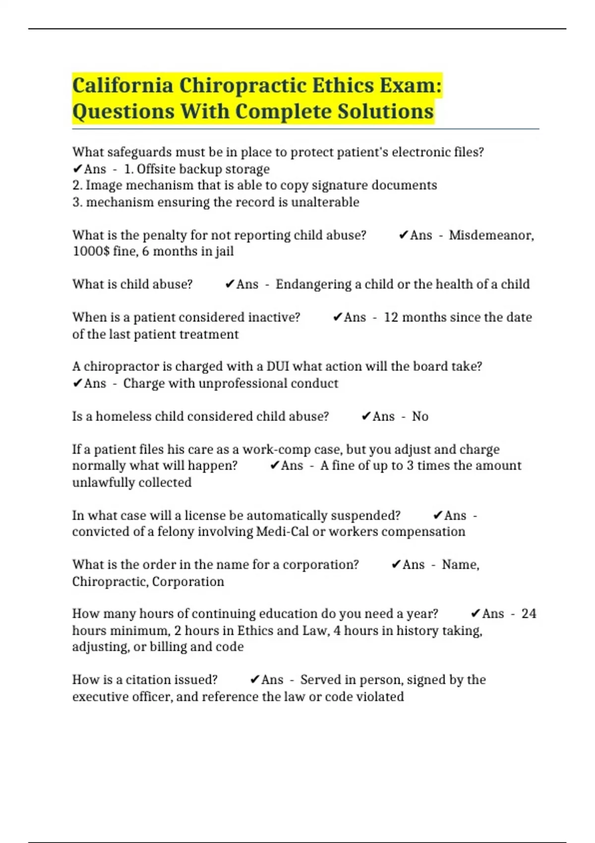 California Chiropractic Ethics Exam: Questions With Complete Solutions