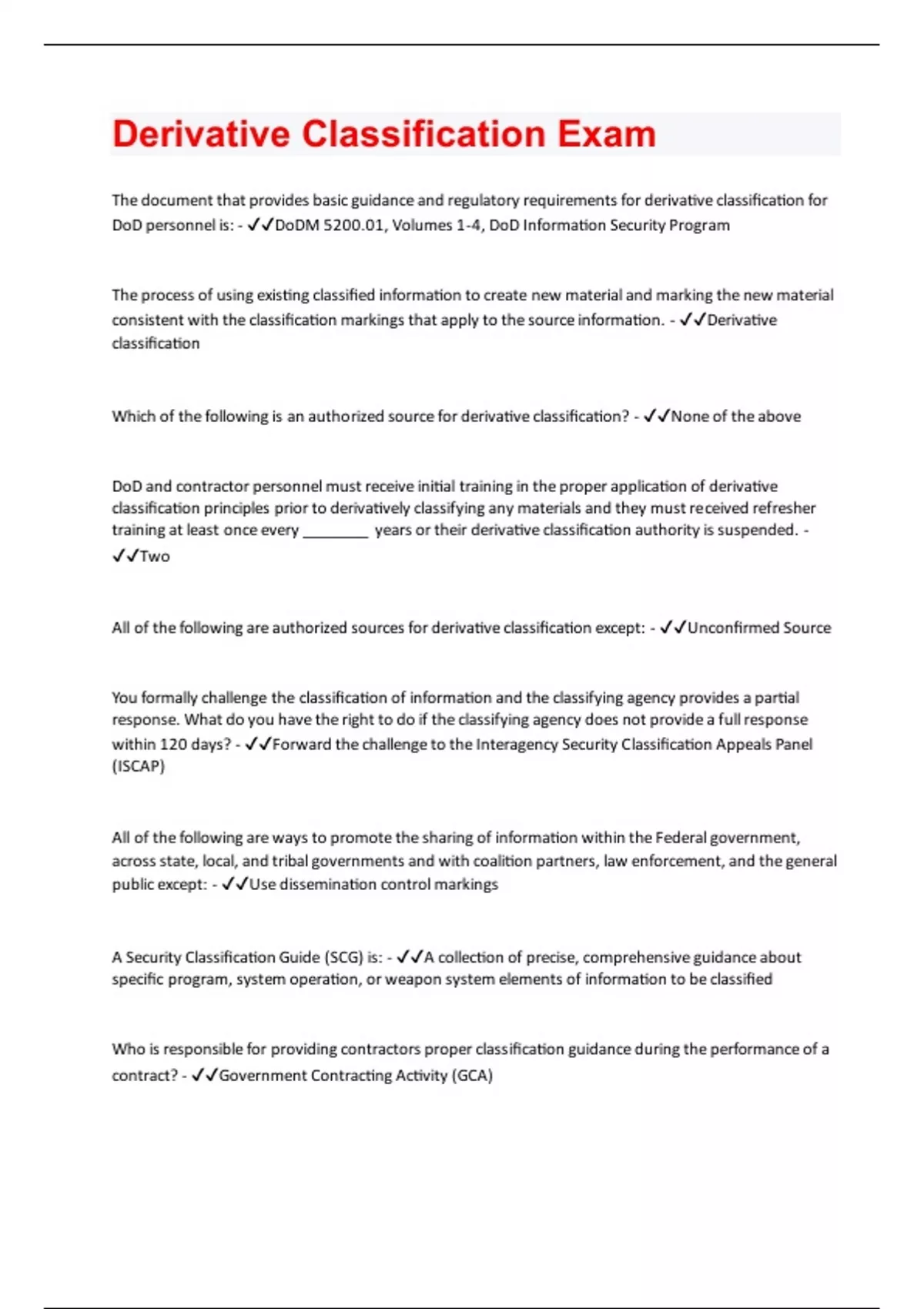 The document that provides basic guidance and regulatory requirements for derivative classification for DoD personnel is: - DoDM 5200.01, Volumes 1-4, DoD Information Security Program The process of using existing classified information to create new material and marking the new material consistent with the classification markings that apply to the source information. - Derivative classification Which of the following is an authorized source for derivative classification? - None of the above DoD and contractor personnel must receive initial training in the proper application of derivative classification principles prior to derivatively classifying any materials and they must received refresher training at least once every ________ years or their derivative classification authority is suspended. - Two All of the following are authorized sources for derivative classification except: - Unconfirmed Source You formally challenge the classification of information and the classifying agency provides a partial response. What do you have the right to do if the classifying agency does not provide a full response within 120 days? - Forward the challenge to the Interagency Security Classification Appeals Panel (ISCAP) All of the following are ways to promote the sharing of information within the Federal government, across state, local, and tribal governments and with coalition partners, law enforcement, and the general public except: - Use dissemination control markings A Security Classification Guide (SCG) is: - A collection of precise, comprehensive guidance about specific program, system operation, or weapon system elements of information to be classified Who is responsible for providing contractors proper classification guidance during the performance of a contract? - Government Contracting Activity (GCA)