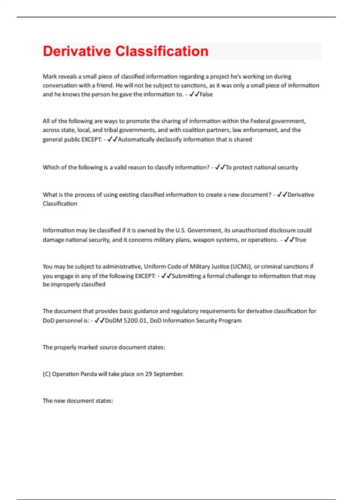 Mark reveals a small piece of classified information regarding a project he's working on during conversation with a friend. He will not be subject to sanctions, as it was only a small piece of information and he knows the person he gave the information to. - False All of the following are ways to promote the sharing of information within the Federal government, across state, local, and tribal governments, and with coalition partners, law enforcement, and the general public EXCEPT: - Automatically declassify information that is shared Which of the following is a valid reason to classify information? - To protect national security What is the process of using existing classified information to create a new document? - Derivative Classification Information may be classified if it is owned by the U.S. Government, its unauthorized disclosure could damage national security, and it concerns military plans, weapon systems, or operations. - True You may be subject to administrative, Uniform Code of Military Justice (UCMJ), or criminal sanctions if you engage in any of the following EXCEPT: - Submitting a formal challenge to information that may be improperly classified The document that provides basic guidance and regulatory requirements for derivative classification for DoD personnel is: - DoDM 5200.01, DoD Information Security Program The properly marked source document states: (C) Operation Panda will take place on 29 September. The new document states:(C) On 29 September, Operation Panda will commence. What concept is used to derivatively classify the statement in the new document? - Contained in