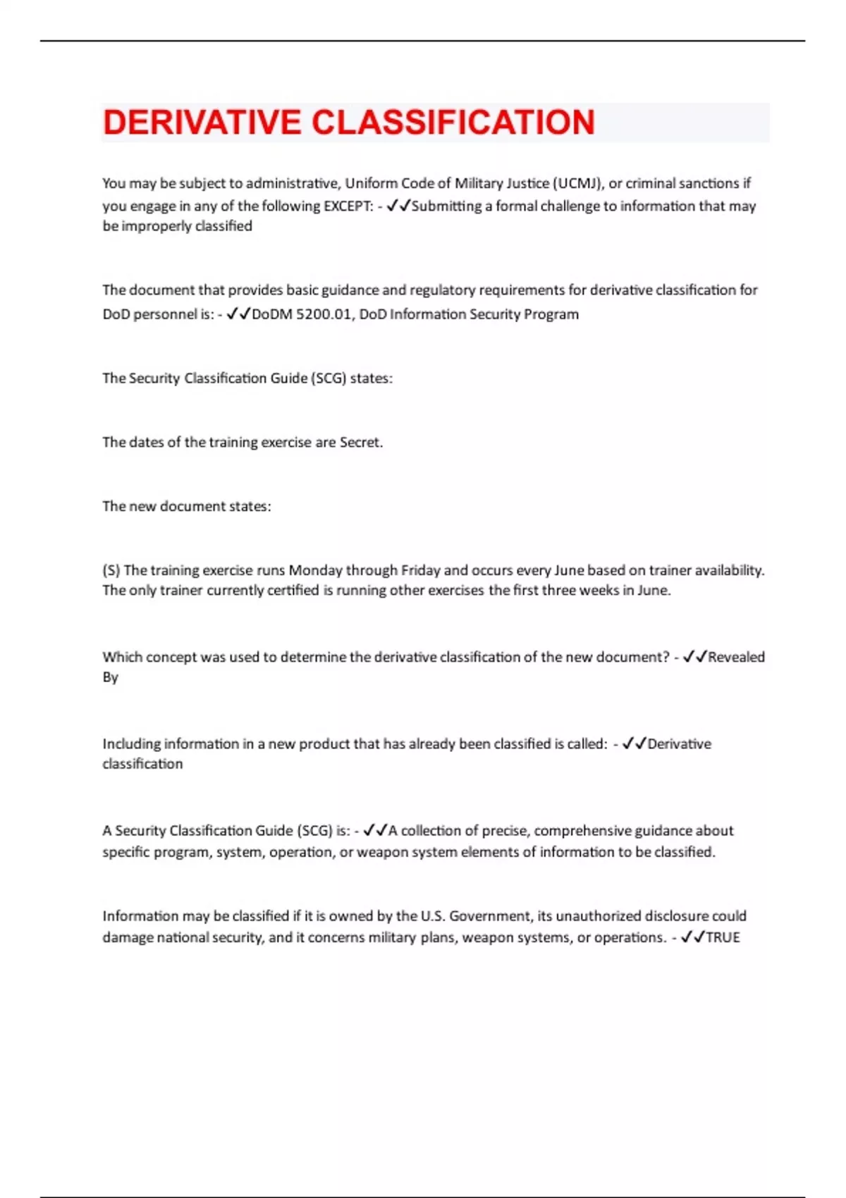You may be subject to administrative, Uniform Code of Military Justice (UCMJ), or criminal sanctions if you engage in any of the following EXCEPT: - Submitting a formal challenge to information that may be improperly classified The document that provides basic guidance and regulatory requirements for derivative classification for DoD personnel is: - DoDM 5200.01, DoD Information Security Program The Security Classification Guide (SCG) states: The dates of the training exercise are Secret. The new document states: (S) The training exercise runs Monday through Friday and occurs every June based on trainer availability. The only trainer currently certified is running other exercises the first three weeks in June. Which concept was used to determine the derivative classification of the new document? - Revealed By Including information in a new product that has already been classified is called: - Derivative classification A Security Classification Guide (SCG) is: - A collection of precise, comprehensive guidance about specific program, system, operation, or weapon system elements of information to be classified. Information may be classified if it is owned by the U.S. Government, its unauthorized disclosure could damage national security, and it concerns military plans, weapon systems, or operations. - TRUE