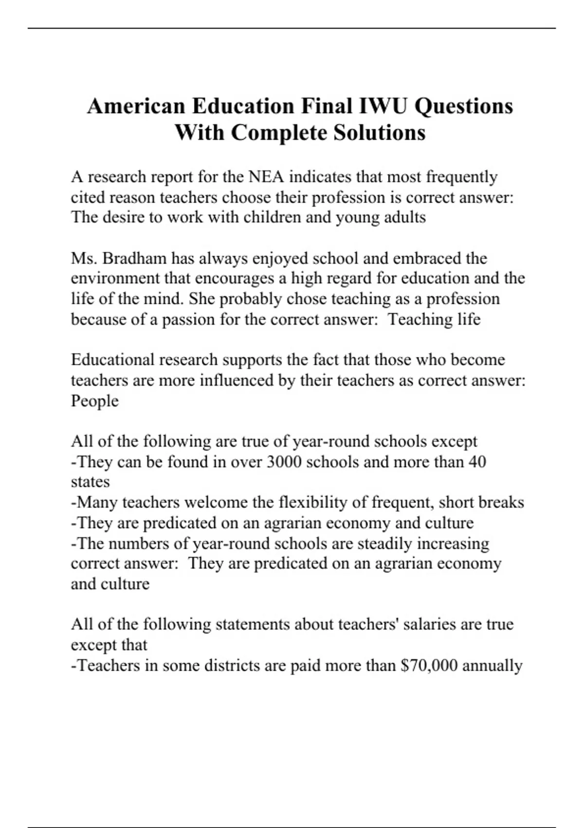 A research report for the NEA indicates that most frequently cited reason teachers choose their profession is correct answer: The desire to work with children and young adults Ms. Bradham has always enjoyed school and embraced the environment that encourages a high regard for education and the life of the mind. She probably chose teaching as a profession because of a passion for the correct answer: Teaching life Educational research supports the fact that those who become teachers are more influenced by their teachers as correct answer: People All of the following are true of year-round schools except -They can be found in over 3000 schools and more than 40 states -Many teachers welcome the flexibility of frequent, short breaks -They are predicated on an agrarian economy and culture -The numbers of year-round schools are steadily increasing correct answer: They are predicated on an agrarian economy and culture All of the following statements about teachers' salaries are true except that -Teachers in some districts are paid more than $70,000 annually -School districts serving the nation's 100 largest cities had maximum salaries exceeding $70,000 -Average teacher salaries have steadily increased since the