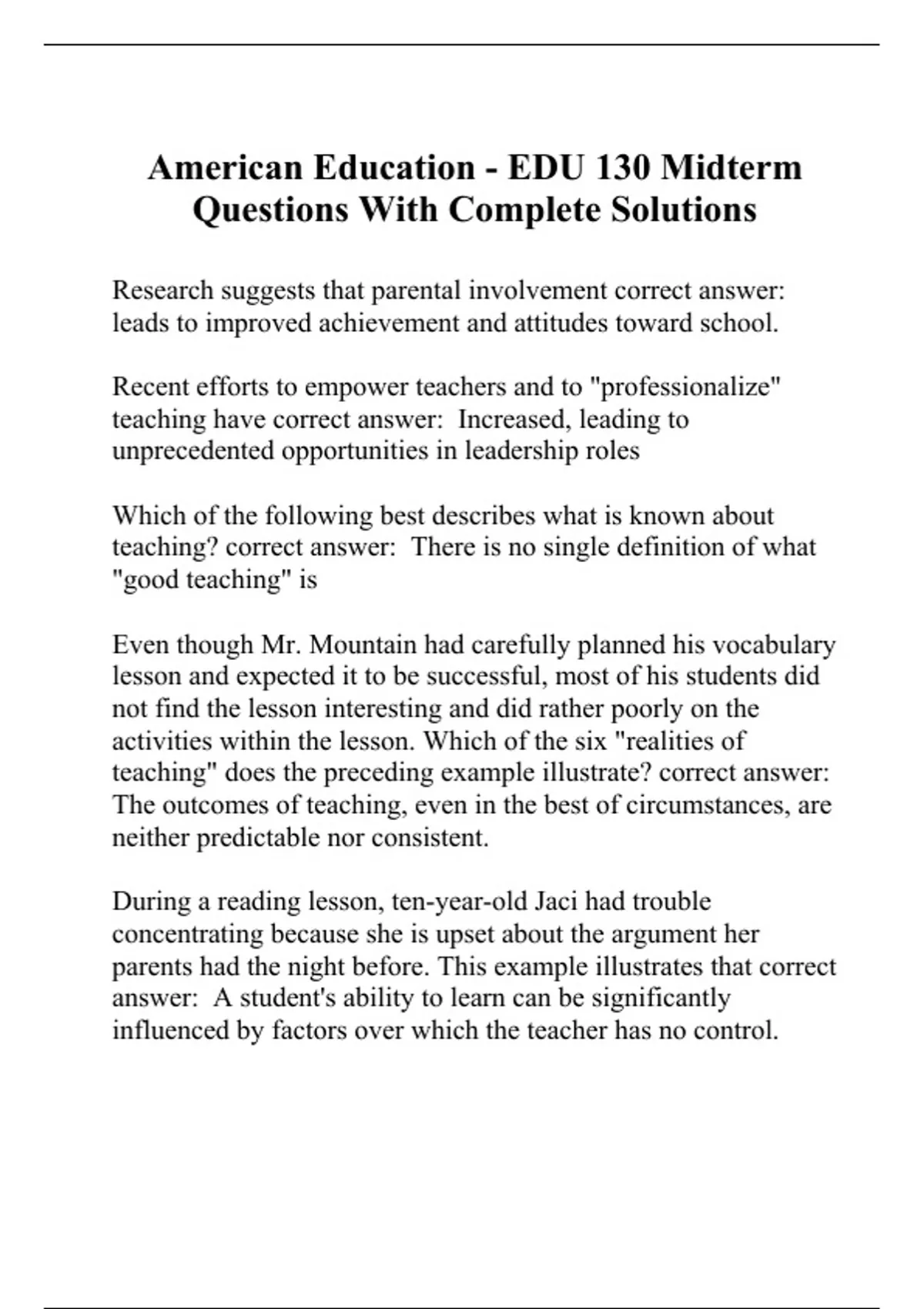 American Education - EDU 130 Midterm Questions With Complete Solutions