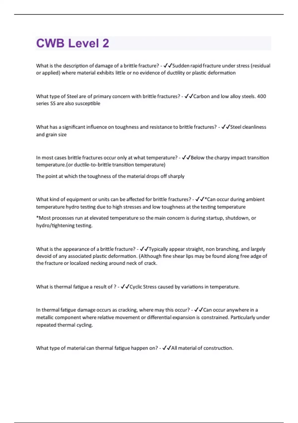 What is the description of damage of a brittle fracture? - Sudden rapid fracture under stress (residual or applied) where material exhibits little or no evidence of ductility or plastic deformation What type of Steel are of primary concern with brittle fractures? - Carbon and low alloy steels. 400 series SS are also susceptible What has a significant influence on toughness and resistance to brittle fractures? - Steel cleanliness and grain size In most cases brittle fractures occur only at what temperature? - Below the charpy impact transition temperature.(or ductile-to-brittle transition temperature) The point at which the toughness of the material drops off sharply What kind of equipment or units can be affected for brittle fractures? - *Can occur during ambient temperature hydro testing due to high stresses and low toughness at the testing temperature *Most processes run at elevated temperature so the main concern is during startup, shutdown, or hydro/tightening testing. What is the appearance of a brittle fracture? - Typically appear straight, non branching, and largely devoid of any associated plastic deformation. (Although fine shear lips may be found along free adge of the fracture or localized necking around neck of crack. What is thermal fatigue a result of ? - Cyclic Stress caused by variations in temperature. In thermal fatigue damage occurs as cracking, where may this occur? - Can occur anywhere in a metallic component where relative movement or differential expansion is constrained. Particularly under repeated thermal cycling. What type of material can thermal fatigue happen on? - All material of construction.