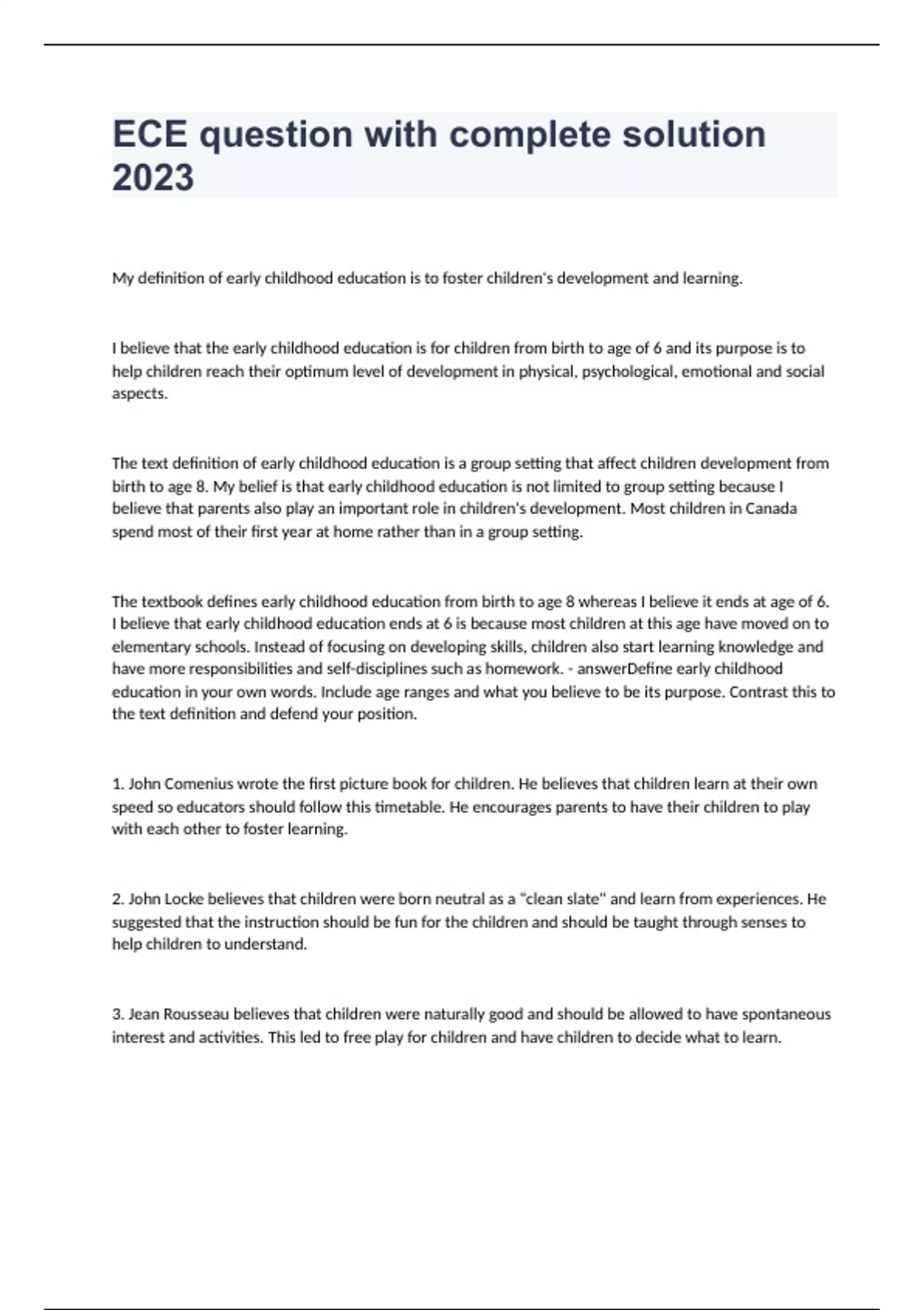 ECE question with complete solution 2023My definition of early childhood education is to foster children's development and learning. I believe that the early childhood education is for children from birth to age of 6 and its purpose is to help children reach their optimum level of development in physical, psychological, emotional and social aspects. The text definition of early childhood education is a group setting that affect children development from birth to age 8. My belief is that early childhood education is not limited to group setting because I believe that parents also play an important role in children's development. Most children in Canada spend most of their first year at home rather than in a group setting. The textbook defines early childhood education from birth to age 8 whereas I believe it ends at age of 6. I believe that early childhood education ends at 6 is because most children at this age have moved on to elementary schools. Instead of focusing on developing skills, children also start learning knowledge and have more responsibilities and self-disciplines such as homework. - answerDefine early childhood education in your own words. Include age ranges and what you believe to be its purpose. Contrast this to the text definition and defend your position. 1. John Comenius wrote the first picture book for children. He believes that children learn at their own speed so educators should follow this timetable. He encourages parents to have their children to play with each other to foster learning. 2. John Locke believes that children were born neutral as a "clean slate" and learn from experiences. He suggested that the instruction should be fun for the children and should be taught through senses to help children to understand. 3. Jean Rousseau believes that children were naturally good and should be allowed to have spontaneous interest and activities. This led to free play for children and have children to decide what to learn. 4. Johann Pestalozzi starts the idea of the integrated curriculum for the whole child's development including the hand, the head and the heart.