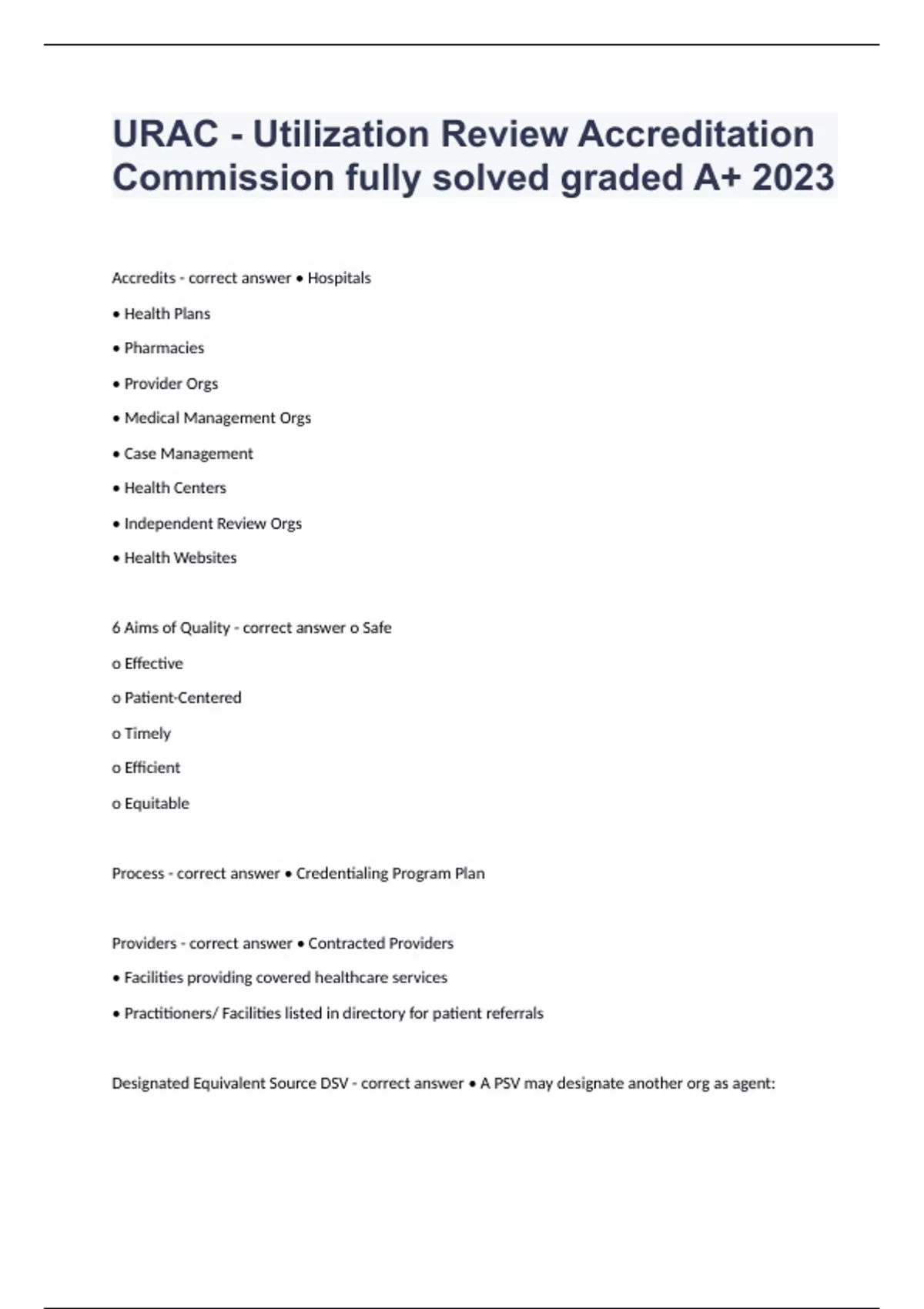 URAC - Utilization Review Accreditation Commission fully solved graded A+ 2023Accredits - correct answer • Hospitals • Health Plans • Pharmacies • Provider Orgs • Medical Management Orgs • Case Management • Health Centers • Independent Review Orgs • Health Websites 6 Aims of Quality - correct answer o Safe o Effective o Patient-Centered o Timely o Efficient o Equitable Process - correct answer • Credentialing Program Plan Providers - correct answer • Contracted Providers • Facilities providing covered healthcare services • Practitioners/ Facilities listed in directory for patient referrals Designated Equivalent Source DSV - correct answer • A PSV may designate another org as agent: