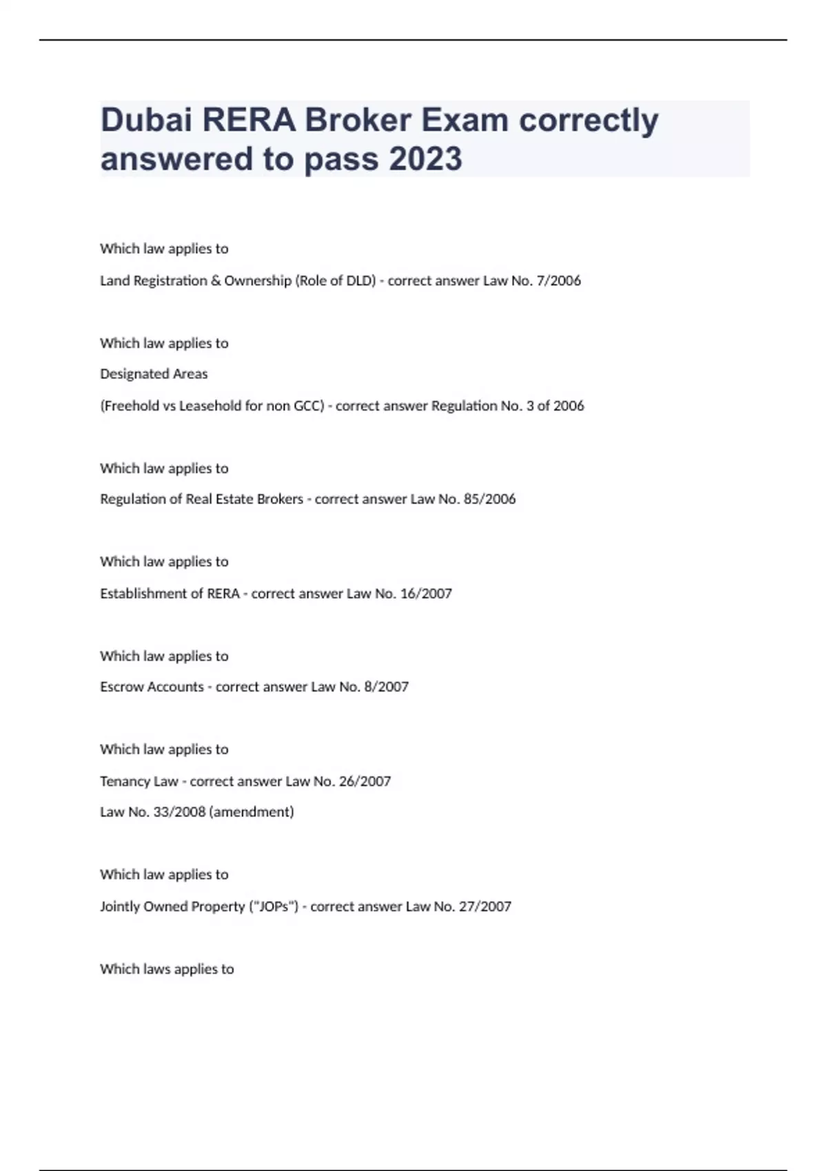 Dubai RERA Broker Exam correctly answered to pass 2023Which law applies to Land Registration & Ownership (Role of DLD) - correct answer Law No. 7/2006 Which law applies to Designated Areas (Freehold vs Leasehold for non GCC) - correct answer Regulation No. 3 of 2006 Which law applies to Regulation of Real Estate Brokers - correct answer Law No. 85/2006 Which law applies to Establishment of RERA - correct answer Law No. 16/2007 Which law applies to Escrow Accounts - correct answer Law No. 8/2007 Which law applies to Tenancy Law - correct answer Law No. 26/2007 Law No. 33/2008 (amendment) Which law applies to Jointly Owned Property ("JOPs") - correct answer Law No. 27/2007 Which laws applies to