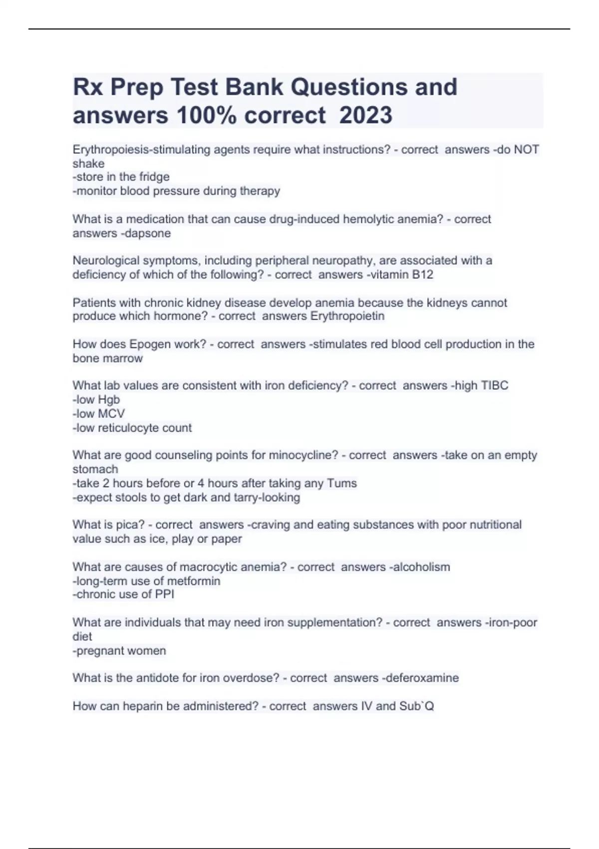 Rx Prep Test Bank Questions and answers 100% correct 2023 Erythropoiesis-stimulating agents require what instructions? - correct answers -do NOT shake -store in the fridge -monitor blood pressure during therapy What is a medication that can cause drug-induced hemolytic anemia? - correct answers -dapsone
