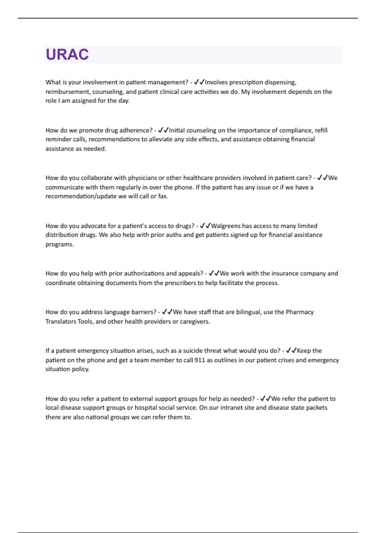 What is your involvement in patient management? - Involves prescription dispensing, reimbursement, counseling, and patient clinical care activities we do. My involvement depends on the role I am assigned for the day. How do we promote drug adherence? - Initial counseling on the importance of compliance, refill reminder calls, recommendations to alleviate any side effects, and assistance obtaining financial assistance as needed. How do you collaborate with physicians or other healthcare providers involved in patient care? - We communicate with them regularly in over the phone. If the patient has any issue or if we have a recommendation/update we will call or fax. How do you advocate for a patient's access to drugs? - Walgreens has access to many limited distribution drugs. We also help with prior auths and get patients signed up for financial assistance programs. How do you help with prior authorizations and appeals? - We work with the insurance company and coordinate obtaining documents from the prescribers to help facilitate the process. How do you address language barriers? - We have staff that are bilingual, use the Pharmacy Translators Tools, and other health providers or caregivers. If a patient emergency situation arises, such as a suicide threat what would you do? - Keep the patient on the phone and get a team member to call 911 as outlines in our patient crises and emergency situation policy. How do you refer a patient to external support groups for help as needed? - We refer the patient to local disease support groups or hospital social service. On our intranet site and disease state packets there are also national groups we can refer them to