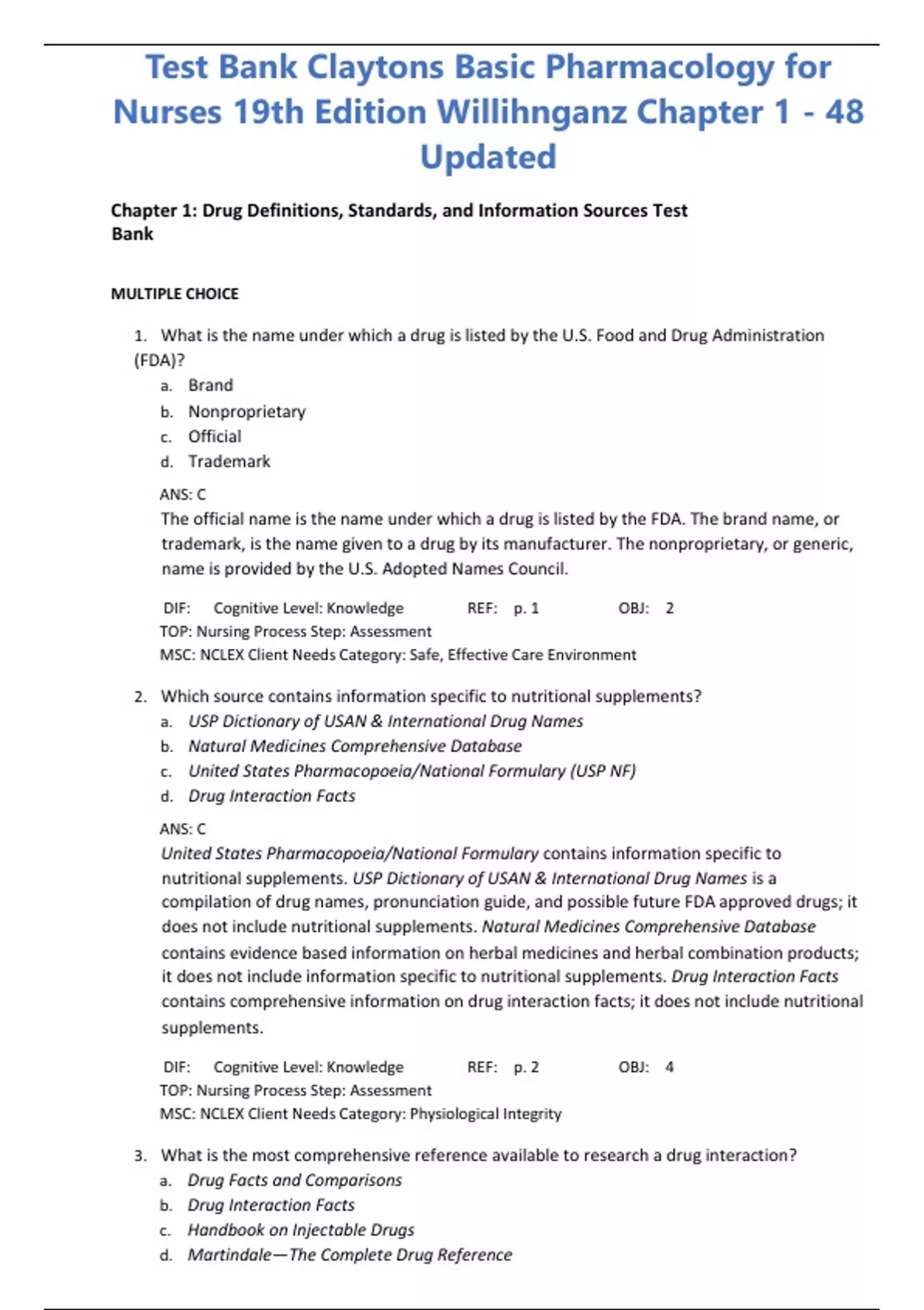 Test Bank Claytons Basic Pharmacology for Nurses 19th Edition Willihnganz Chapter 1 - 48 Updated