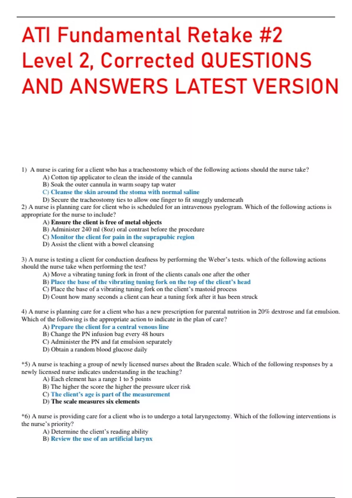 ATI Fundamental Retake #2 Level 2, Corrected QUESTIONS AND ANSWERS LATEST VERSION