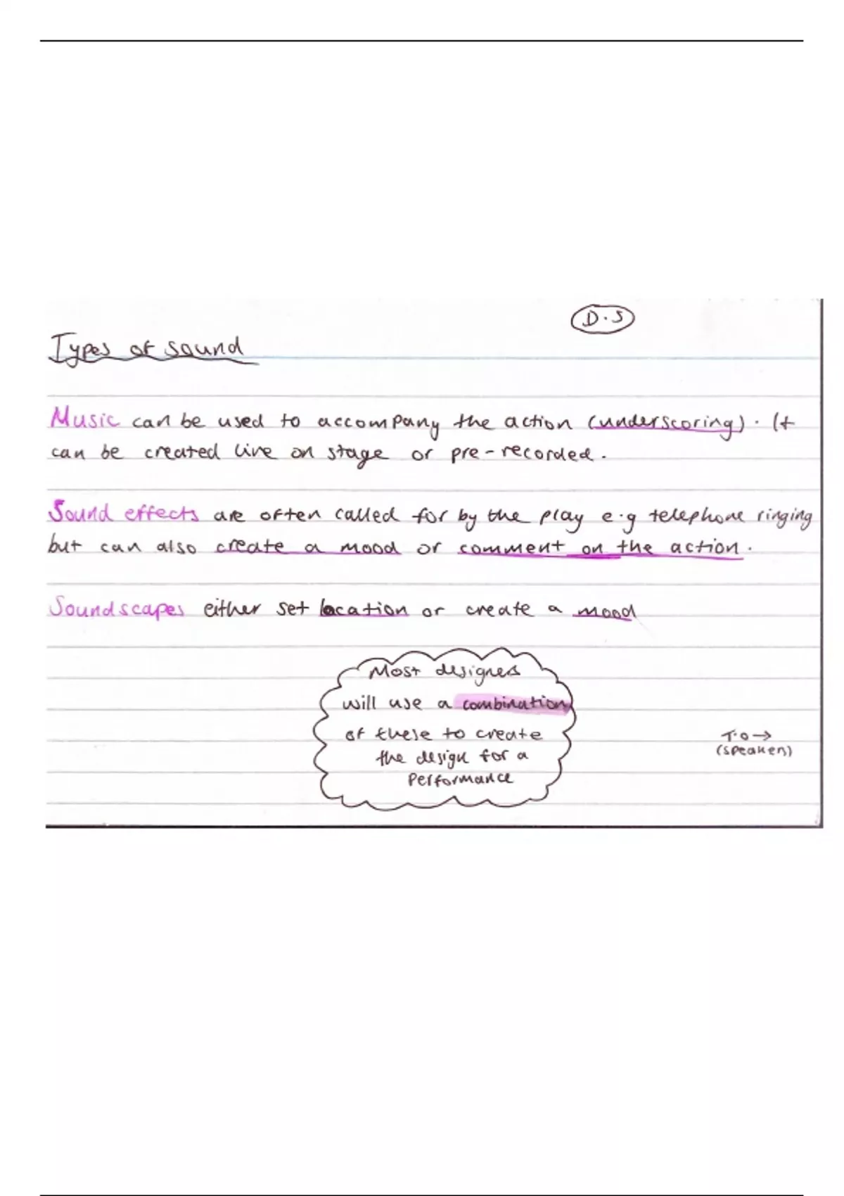 Notes on sound design for component 3 (written exam). Includes descriptions of different styles of sound, how sound design creates impact etc. Enhanced understanding of your design concept allows access to top band marks.