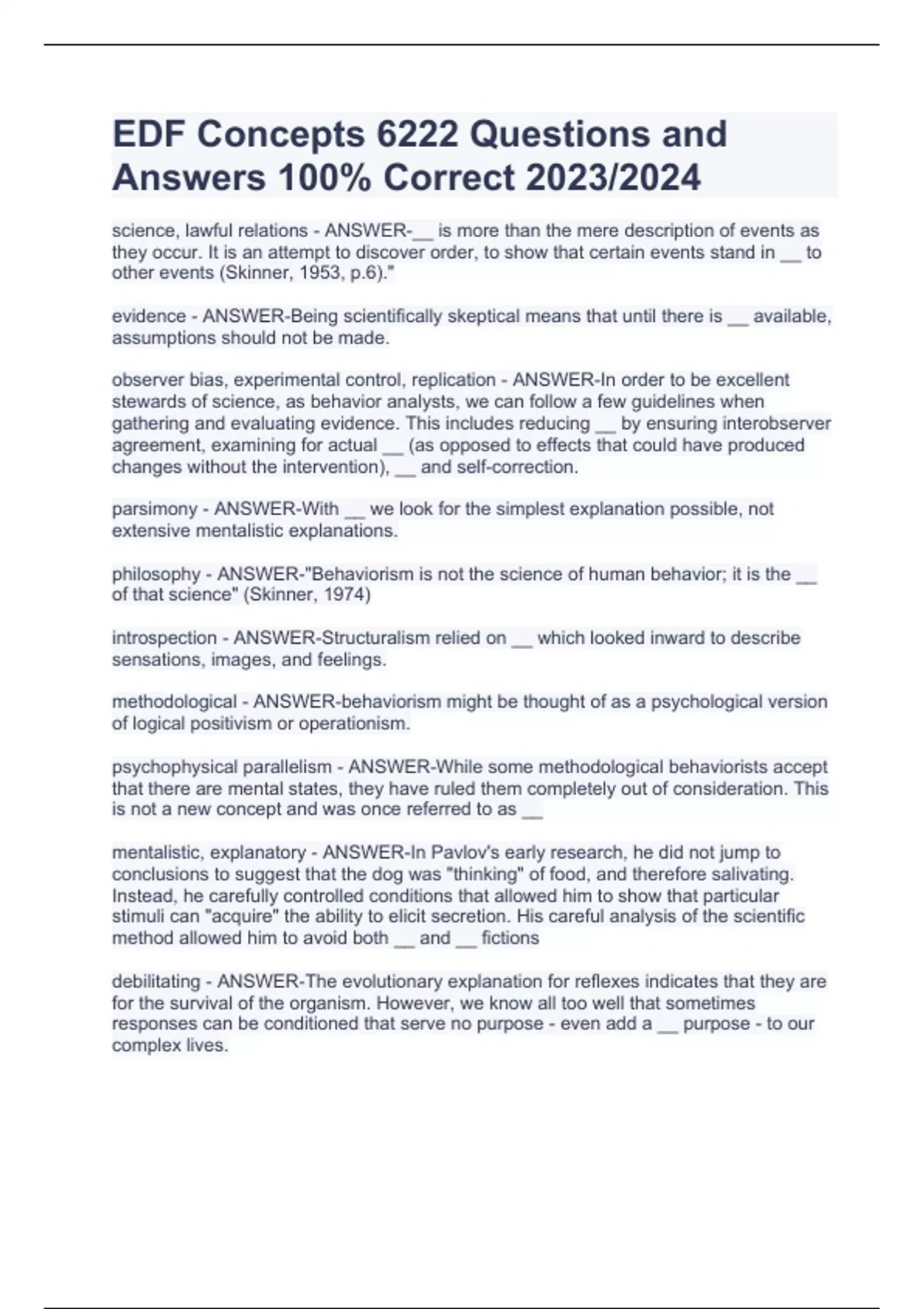 EDF 6222 Final Exam Review (100% Correct) Unique to humans is... correct answers the ability for language to further influence superstitious behavior Superstitious behavior arises from... correct answers accidental contingencies Superstitious behavior illustrates that... correct answers reinforcement is effective even if it isn't related to the behavior that follows What schedules are most likely in the natural environment correct answers Variable schedules Matching law correct answers Quantitative relationship between rates of response and rates of reinforcement in concurrent schedules Long-term consequences are correct answers delayed Speed and effectiveness of punishment correct answers The more delayed the punishment, the less effective it is Belushi effect of drug tolerance correct answers Removal of the conditioned stimulus (the environment) allowed the drug to effect him differently, causing overdose The US Office of Technology assessments estimates that __ of modern medical treatments in common use have been proved as effective correct answers 1/5 Hart & Risley study correct answers Conducted to look for the cause of the disparity in linguistic progress among children from different socioeconomic backgrounds Children who come from a welfare background have __ as much experience per hour with words being spoken to them than a working class child correct answers 1/2 Children who come from a welfare background have __ as much experience per hour with words being spoken to them than a professional class child correct answers 1/3 Should children be exposed to natural negative consequences correct answers Yes What makes praise so effective correct answers Being specific, immediate, and warranted - not generic Traditional viewpoints of mental health correct answers Involve mentalistic and unobservable causes Why is talk therapy useful correct answers We all want positive social reinforcement