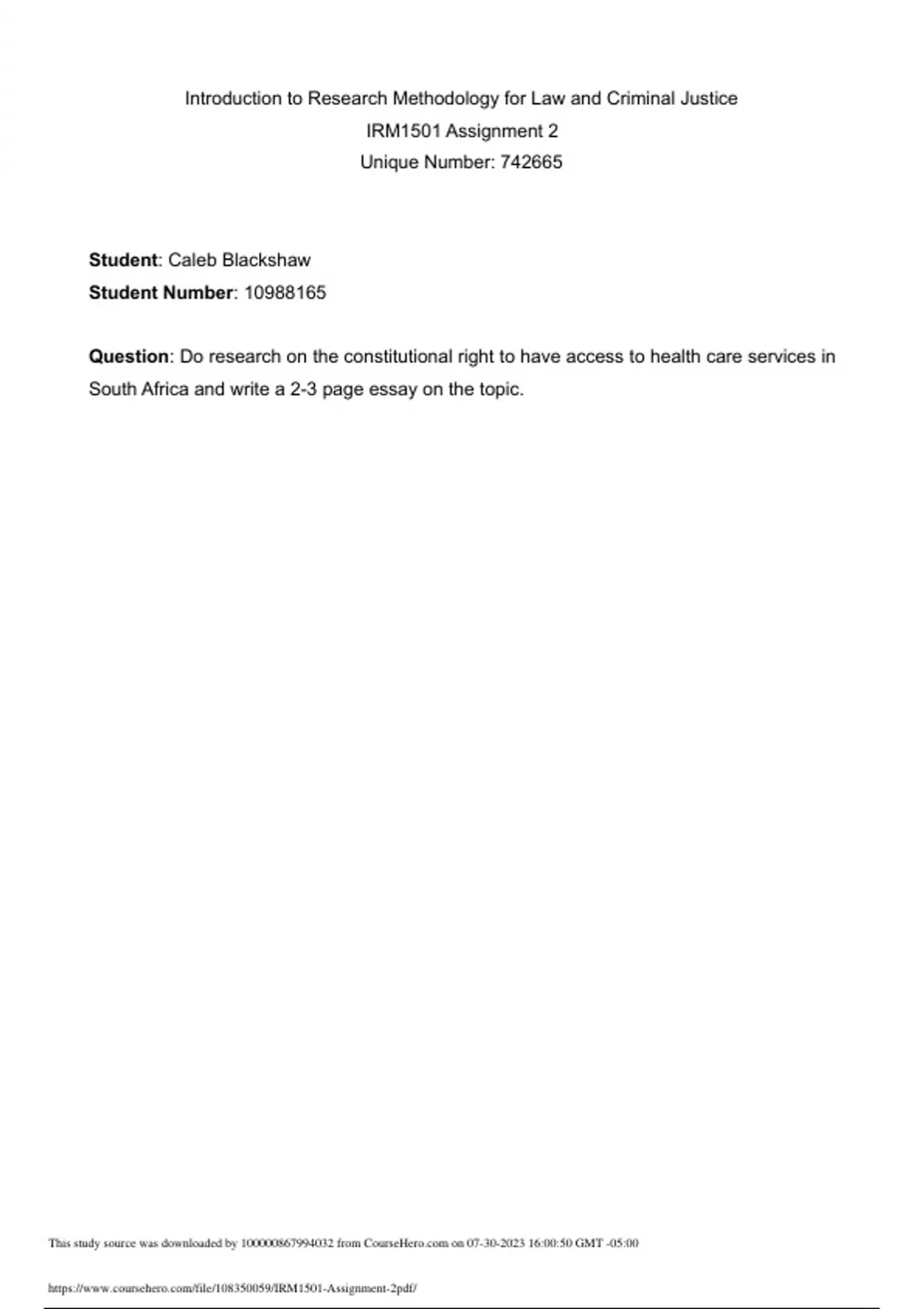 Introduction to Research Methodology for Law and Criminal Justice IRM1501 Assignment 2 Unique Number: 742665