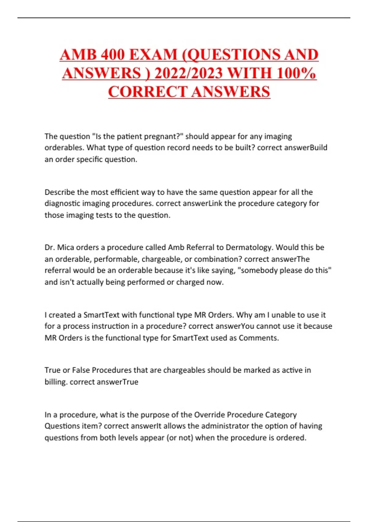 AMB 400 EXAM (QUESTIONS AND ANSWERS ) 2022/2023 WITH 100% CORRECT ANSWERS The question "Is the patient pregnant?" should appear for any imaging orderables. What type of question record needs to be built? Build an order specific question. Describe the most efficient way to have the same question appear for all the diagnostic imaging procedures. Link the procedure category for those imaging tests to the question. Dr. Mica orders a procedure called Amb Referral to Dermatology. Would this be an orderable, performable, chargeable, or combination? The referral would be an orderable because it's like saying,