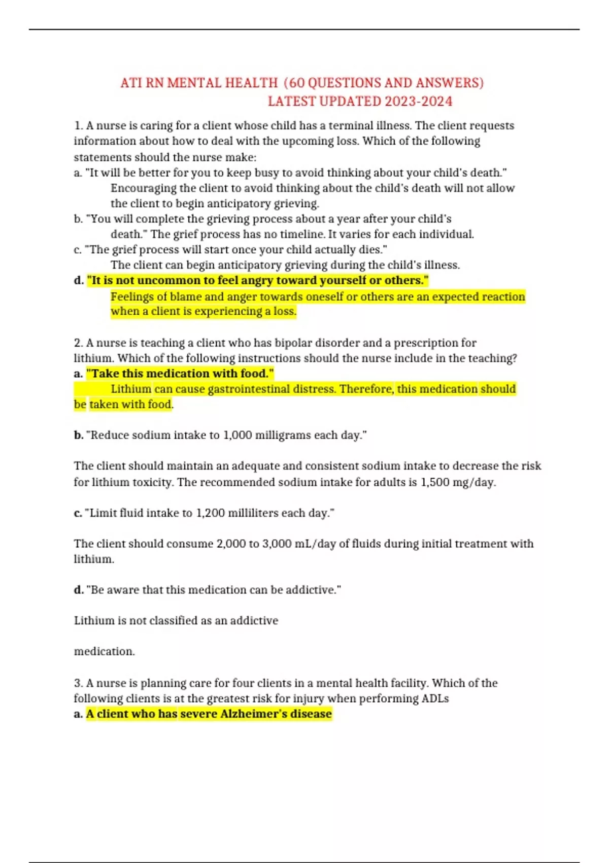 ATI RN MENTAL HEALTH (60 QUESTIONS AND ANSWERS) LATEST UPDATED