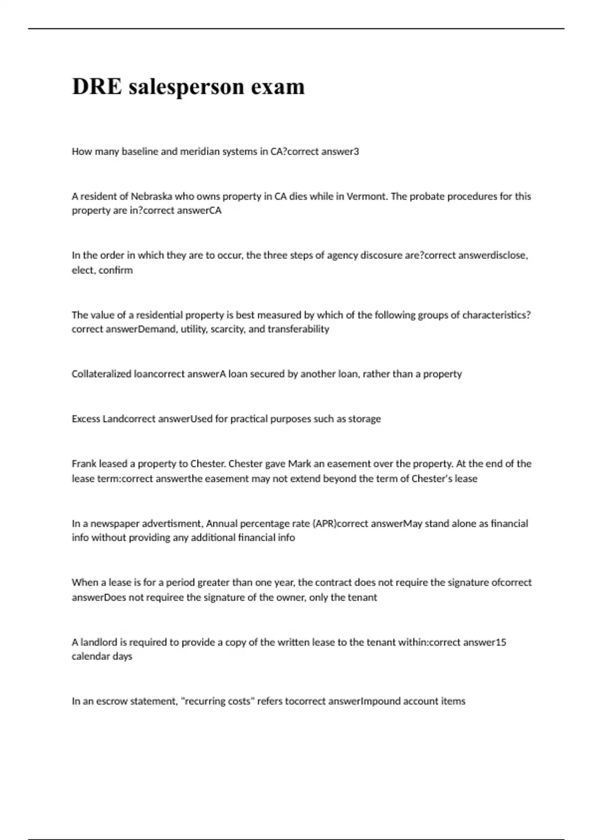 How many baseline and meridian systems in CA? 3 A resident of Nebraska who owns property in CA dies while in Vermont. The probate procedures for this property are in? CA In the order in which they are to occur, the three steps of agency discosure are? disclose, elect, confirm The value of a residential property is best measured by which of the following groups of characteristics? Demand, utility, scarcity, and transferability Collateralized loan A loan secured by another loan, rather than a property Excess Land Used for practical purposes such as storage Frank leased a property to Chester. Chester gave Mark an easement over the property. At the end of the lease term: the easement may not extend beyond the term of Chester's lease In a newspaper advertisment, Annual percentage rate (APR) May stand alone as financial info without providing any additional financial info When a lease is for a period greater than one year, the contract does not require the signature of Does not requiree the signature of the owner, only the tenant A landlord is required to provide a copy of the written lease to the tenant within: 15 calendar days In an escrow statement, "recurring costs" refers to Impound account items A subdivider needs to give a copy of the real estate commisionners public report to: Anyone upon request Quiet title: A court action to clear clouds on the title of a property. FHAs and mortgage The FHA insures mortgages but DOES NOT fund them The existance of a military establishment that contains explosives needs to be disclosed if it is located within how miles of the property? 1 mile Option adjustable rate mortgatge (ARM) has negative amortization, meaning that the monthly payments are less than the interest accruing Executor/Executrix as a testator or person making a will, you are allowed to designate an executor or executrix as the representative to carry out your will when you die. If the Real Estate Commissioner feels the need to retract approval of a subdivision... they issue a desist and refrain order Appraising a multi-million dollar home requires: A certified residential license and a certified general license The calendar date that is of most concern to an appraiser is the date: The date That the purchase contract was signed How long does an easement last when no termination or date length is stated? Perpeuity Civil rights act of 1968 Outlawed sexual discrimination in house sales and rentals How does a mortgage provide the most protection to an owner in property default A mortgage requires judicial foreclosure and thus offers the greatest protection as the owner is provided a longer period of time to cure the default The rumsford act Denies discrimination to one to four residential properties as well as vacant land designed for residential use (rumsford-racist) Escheat The STATE GOV takes property upon an owners death if there is no will & no heirs exist.