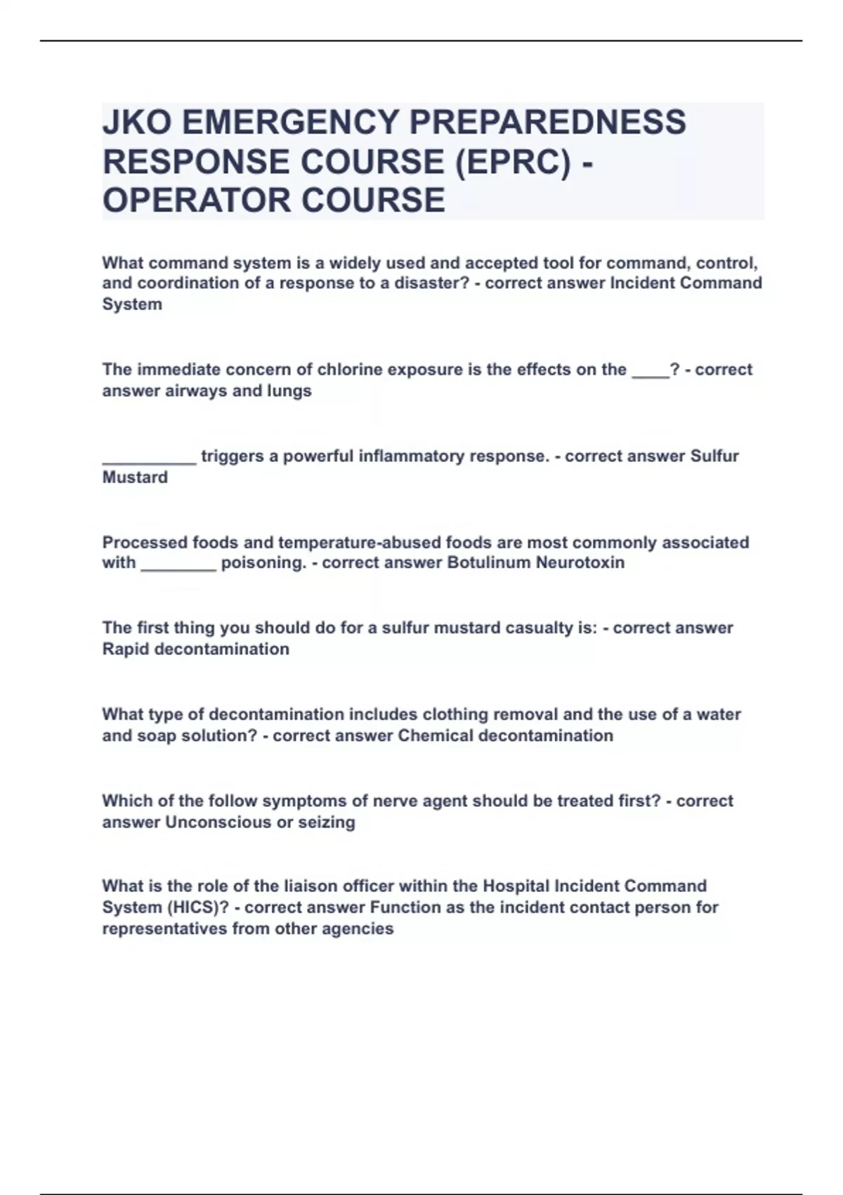 JKO EMERGENCY PREPAREDNESS RESPONSE COURSE (EPRC) - OPERATOR COURSE|UPDATED&VERIFIED|100% SOLVED|GUARANTEED SUCCESS