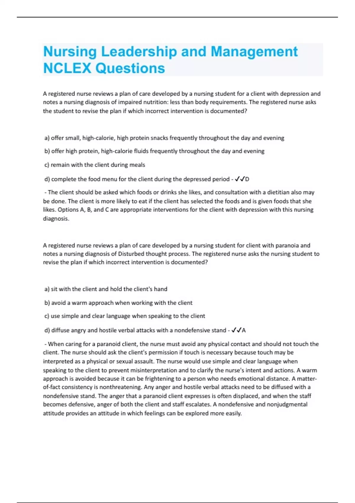 A registered nurse reviews a plan of care developed by a nursing student for a client with depression and notes a nursing diagnosis of impaired nutrition: less than body requirements. The registered nurse asks the student to revise the plan if which incorrect intervention is documented? a) offer small, high-calorie, high protein snacks frequently throughout the day and evening b) offer high protein, high-calorie fluids frequently throughout the day and evening c) remain with the client during meals d) complete the food menu for the client during the depressed period - D - The client should be asked which foods or drinks she likes, and consultation with a dietitian also may be done. The client is more likely to eat if the client has selected the foods and is given foods that she likes. Options A, B, and C are appropriate interventions for the client with depression with this nursing diagnosis. A registered nurse reviews a plan of care developed by a nursing student for client with paranoia and notes a nursing diagnosis of Disturbed thought process. The registered nurse asks the nursing student to revise the plan if which incorrect intervention is documented? a) sit with the client and hold the client's hand b) avoid a warm approach when working with the client c) use simple and clear language when speaking to the client d) diffuse angry and hostile verbal attacks with a nondefensive stand - A - When caring for a paranoid client, the nurse must avoid any physical contact and should not touch the client. The nurse should ask the client's permission if touch is necessary because touch may be interpreted as a physical or sexual assault. The nurse would use simple and clear language when speaking to the client to prevent misinterpretation and to clarify the nurse's intent and actions. A warm approach is avoided because it can be frightening to a person who needs emotional distance. A matterof-fact consistency is nonthreatening. Any anger and hostile verbal attacks need to be diffused with a nondefensive stand. The anger that a paranoid client expresses is often displaced, and when the staff becomes defensive, anger of both the client and staff escalates. A nondefensive and nonjudgmental attitude provides an attitude in which feelings can be explored more easily.A registered nurse is discussing the characteristics of anorexia nervosa with a nursing student. The registered nurse determines that the nursing student needs to further research this disorder if the student states that which of the following is a characteristic of anorexia nervosa? a) personal relationships tend to become more superficial and distant b) social contacts are avoided because of the fear of being invited to eat and being discovered c) the client is being preoccupied with food and meal planning, especially for others d) the client will usually keep her weight near normal - D