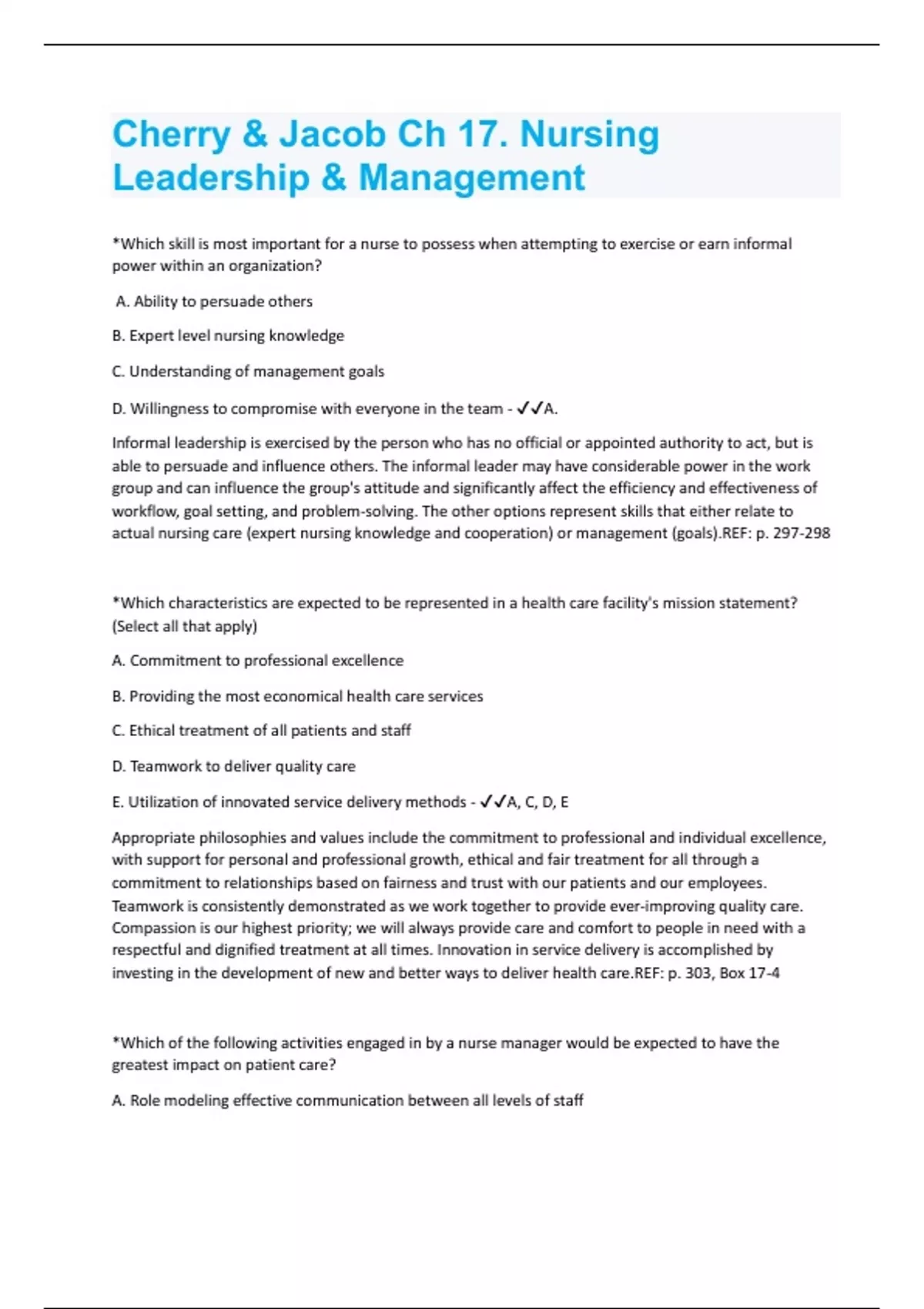 *Which skill is most important for a nurse to possess when attempting to exercise or earn informal power within an organization? A. Ability to persuade others B. Expert level nursing knowledge C. Understanding of management goals D. Willingness to compromise with everyone in the team - A. Informal leadership is exercised by the person who has no official or appointed authority to act, but is able to persuade and influence others. The informal leader may have considerable power in the work group and can influence the group's attitude and significantly affect the efficiency and effectiveness of workflow, goal setting, and problem-solving. The other options represent skills that either relate to actual nursing care (expert nursing knowledge and cooperation) or management (goals).REF: p. 297-298 *Which characteristics are expected to be represented in a health care facility's mission statement? (Select all that apply) A. Commitment to professional excellence B. Providing the most economical health care services C. Ethical treatment of all patients and staff D. Teamwork to deliver quality care E. Utilization of innovated service delivery methods - A, C, D, E Appropriate philosophies and values include the commitment to professional and individual excellence, with support for personal and professional growth, ethical and fair treatment for all through a commitment to relationships based on fairness and trust with our patients and our employees. Teamwork is consistently demonstrated as we work together to provide ever-improving quality care. Compassion is our highest priority; we will always provide care and comfort to people in need with a respectful and dignified treatment at all times. Innovation in service delivery is accomplished by investing in the development of new and better ways to deliver health care.REF: p. 303, Box 17-4 *Which of the following activities engaged in by a nurse manager would be expected to have the greatest impact on patient care? A. Role modeling effective communication between all levels of staffB. Conducting a survey to identify factors affecting staff job satisfaction C. Providing all nursing staff with opportunities to influence unit policies D. Providing all staff members with written copies of organizational policies - A.