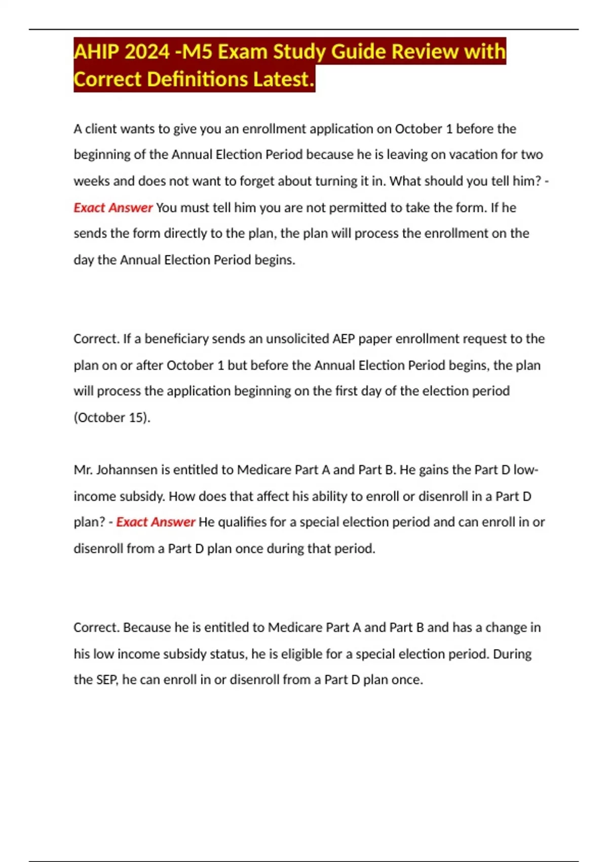 AHIP 2024 -M5 Exam Study Guide Review with Correct Definitions Latest.