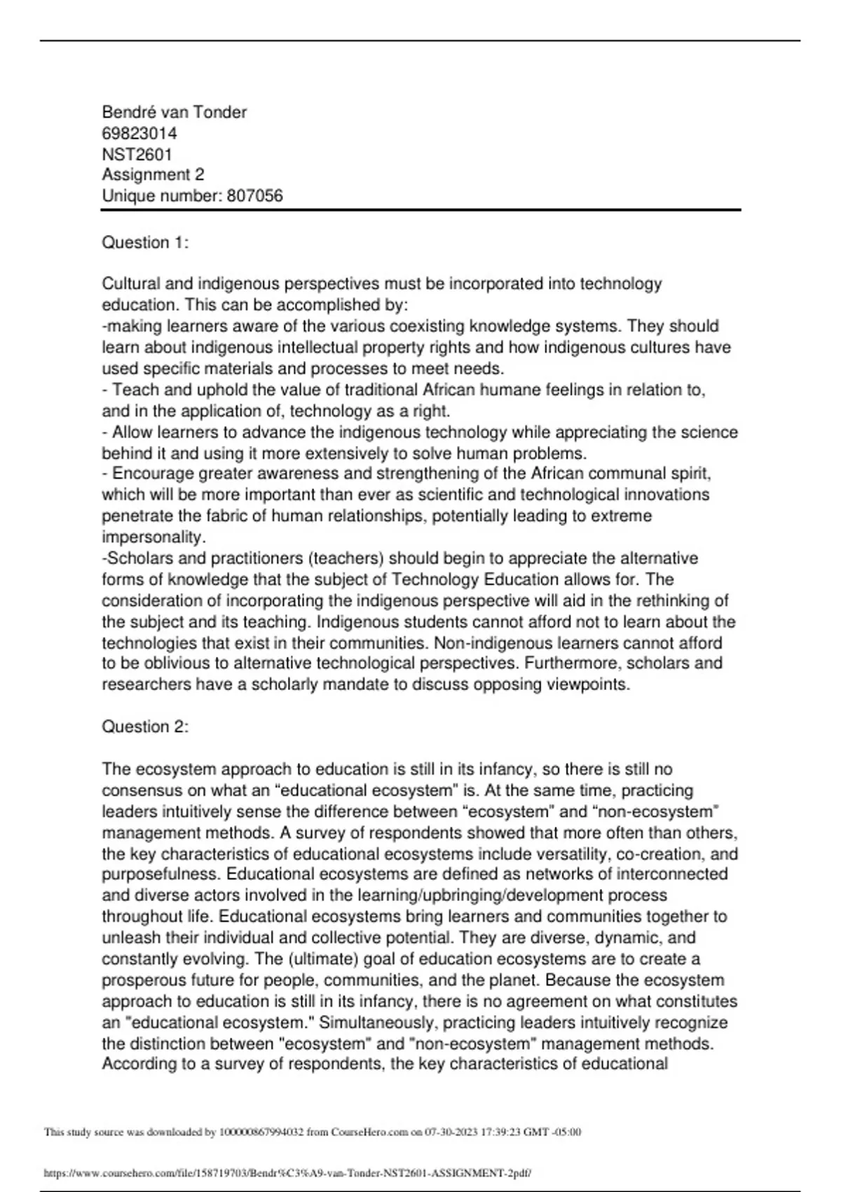 Bendré van Tonder NST2601 Assignment 2 Unique number: Question 1: Cultural and indigenous perspectives must be incorporated into technology education. This can be accomplished by: -making learners aware of the various coexisting knowledge systems. They should learn about indigenous intellectual property rights and how indigenous cultures have used specific materials and processes to meet needs. - Teach and uphold the value of traditional African humane feelings in relation to, and in the application of, technology as a right. - Allow learners to advance the indigenous technology while appreciating the science behind it and using it more extensively to solve human problems. - Encourage greater awareness and strengthening of the African communal spirit, which will be more important than ever as scientific and technological innovations penetrate the fabric of human relationships, potentially leading to extreme impersonality. -Scholars and practitioners (teachers) should begin to appreciate the alternative forms of knowledge that the subject of Technology Education allows for. The consideration of incorporating the indigenous perspective will aid in the rethinking of the subject and its teaching. Indigenous students cannot afford not to learn about the technologies that exist in their communities. Non-indigenous learners cannot afford to be oblivious to alternative technological perspectives. Furthermore, scholars and researchers have a scholarly mandate to discuss opposing viewpoints. Question 2: The ecosystem approach to education is still in its infancy, so there is still no consensus on what an “educational ecosystem” is. At the same time, practicing leaders intuitively sense the difference between “ecosystem” and “non-ecosystem” management methods. A survey of respondents showed that more often than others, the key characteristics of educational ecosystems include versatility, co-creation, and purposefulness. Educational ecosystems are defined as networks of interconnected and diverse actors involved in the learning/upbringing/development process throughout life. Educational ecosystems bring learners and communities together to unleash their individual and collective potential. They are diverse, dynamic, and constantly evolving. The (ultimate) goal of education ecosystems are to create a prosperous future for people, communities, and the planet. Because the ecosystem approach to education is still in its infancy, there is no agreement on what constitutes an "educational ecosystem." Simultaneously, practicing leaders intuitively recognize the distinction between "ecosystem" and "non-ecosystem" management methods. According to a survey of respondents, the key characteristics of educational