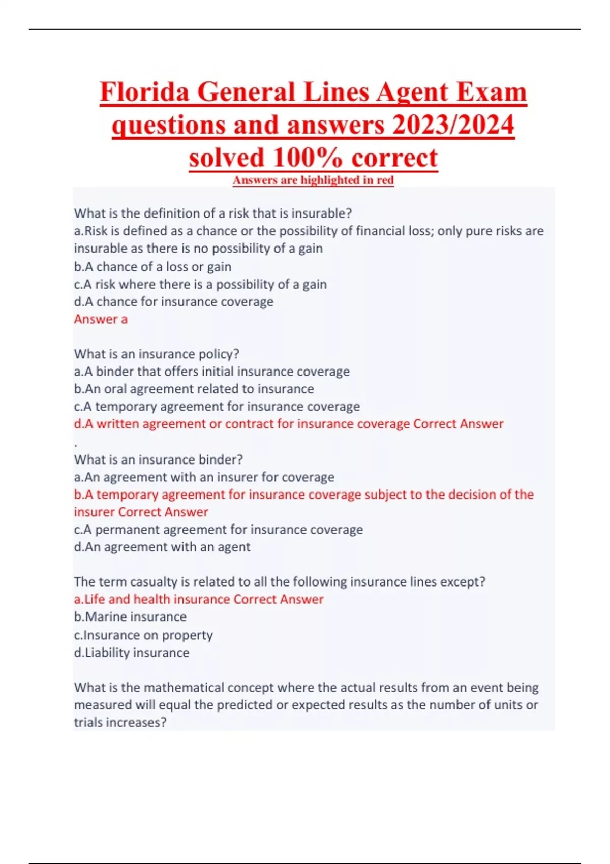 Florida General Lines Agent Exam questions and answers 2023/2024 solved 100% correct What is the definition of a risk that is insurable? a.Risk is defined as a chance or the possibility of financial loss; only pure risks are insurable as there is no possibility of a gain b.A chance of a loss or gain c.A risk where there is a possibility of a gain d.A chance for insurance coverage - ANSWER-a What is an insurance policy? a.A binder that offers initial insurance coverage b.An oral agreement related to insurance c.A temporary agreement for insurance coverage d.A written agreement or contract for insurance coverage - ANSWER-d. What is an insurance binder? a.An agreement with an insurer for coverage b.A temporary agreement for insurance coverage subject to the decision of the insurer c.A permanent agreement for insurance coverage d.An agreement with an agent - ANSWER-b The term casualty is related to all the following insurance lines except? a.Life and health insurance b.Marine insurance c.Insurance on property d.Liability insurance - ANSWER-a What is the mathematical concept where the actual results from an event being measured will equal the predicted or expected results as the number of units or trials increases? - ANSWER-The concept of The Law of Large Numbers. What insurance principle acts to place an insured in the same or similar financial position after a loss as was prior to the loss event? a.The indemnity principle b.The waiver principle c.The principle of utmost good faith d.The principle of subrogation - ANSWER-a What type of contract prevents an insured from transferring the interest of an insurance policy to another? a.A personal contract b.An indemnity contract c.A subrogation contract d.A contract of good faith - ANSWER-a What type of contract is one where the obligation of the insurer is to perform the terms of the contract and is based on the insured satisfying certain conditions? a.A binding contract b.A personal contract c.A conditional contract d.An adhesion contract - ANSWER-c What type of contract is it that the insured cannot negotiate the terms of the contract and must accept the terms specified in the contract? a.An indemnity contract b.A conditional contract c.A contract of adhesion d.A personal contract - ANSWER-c What type of interest (financial or legal) in property must an insured have to benefit from a loss that is insured? a.Insurable interest b.An adhesion interest c.An indemnity interest d.A personal interest - ANSWER-a What insurance doctrine states that a cause of a loss and all other directly related events flowing from the same cause of the loss would be considered as one event? a.The doctrine of insurable interest b.The doctrine of proximate cause c.The loss doctrine d.The doctrine of classification - ANSWER-b John got in an accident that damaged his automobile, what would be considered as what type of loss? a.Direct loss