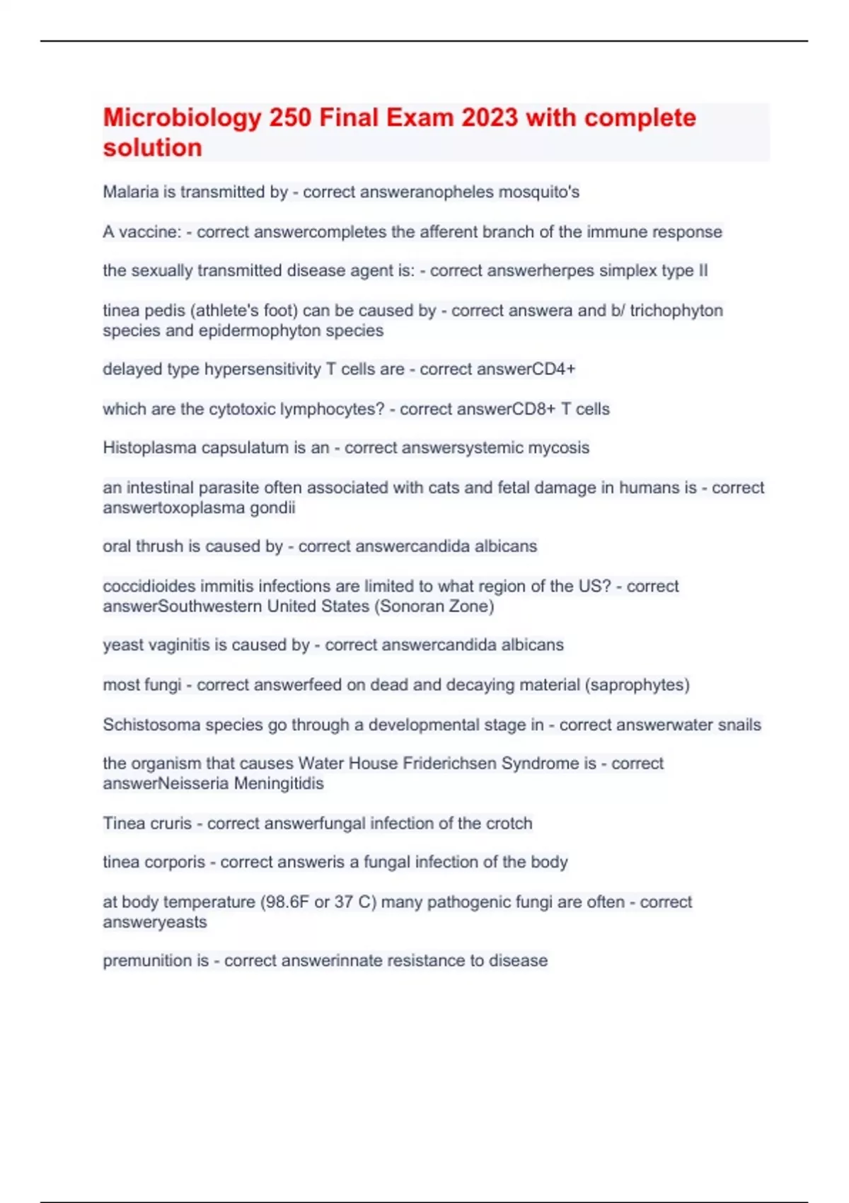 Malaria is transmitted by - correct answeranopheles mosquito's A vaccine: - correct answercompletes the afferent branch of the immune response the sexually transmitted disease agent is: - correct answerherpes simplex type II tinea pedis (athlete's foot) can be caused by - correct answera and b/ trichophyton species and epidermophyton species delayed type hypersensitivity T cells are - correct answerCD4+ which are the cytotoxic lymphocytes? - correct answerCD8+ T cells Histoplasma capsulatum is an - correct answersystemic mycosis an intestinal parasite often associated with cats and fetal damage in humans is - correct answertoxoplasma gondii oral thrush is caused by - correct answercandida albicans coccidioides immitis infections are limited to what region of the US? - correct answerSouthwestern United States (Sonoran Zone) yeast vaginitis is caused by - correct answercandida albicans most fungi - correct answerfeed on dead and decaying material (saprophytes) Schistosoma species go through a developmental stage in - correct answerwater snails the organism that causes Water House Friderichsen Syndrome is - correct answerNeisseria Meningitidis Tinea cruris - correct answerfungal infection of the crotch tinea corporis - correct answeris a fungal infection of the body at body temperature (98.6F or 37 C) many pathogenic fungi are often - correct answeryeasts premunition is - correct answerinnate resistance to disease a mixed infection occurs when - correct answertwo or more organisms are involved in the infection the organism that causes rice water stool (massive diarrhea) is - correct answervibrio cholerae autumnal fever( leptospirosis) is caused by - correct answerleptospira interrogans the basic molecules of life are - correct answernucleic acids, proteins, carbohydrates and lipids antibody enhanced phagocytes is called - correct answeropsonization the antibody class that causes anaphylactic (type 1) hypersensitivities is - correct answerIgE conjugation is - correct answera gene moves through a sex pilus rocky mountain spotted fever is - correct answera and b/ transmitted by ticks and extremely virulent in the bitterroot valley which of the following helps make a molecule a good immunogen? - correct answerlarge mass and complexity the complete virus particle is called - correct answera viron cells which can initiate the inflammatory response are - correct answermast cells giardia lamblia causes - correct answersteatorrhoea flossing helps prevent - correct answercavities ( caries) shingles is associated with - correct answervaricella zoster virus kopliks spots are absolutely diagnostic (pathognomonic) for - correct answermeasles which of the following is a sexually transmitted disease agent? - correct answera and b/ neisseria gonorrhoeae and treponema pallidum a common gut bacteria is - correct answerecherichia coli the agent/organism that expresses considerable antigenic variation is - correct answertrypanosoma brucei coccidioides immitis generally causes - correct answerlung infections lockjaw (tetanus) is caused by - correct answerclostridium tetani organisms which have internal organelles such as a nucleus are called - correct answereukaryote antibody covering viral receptor molecules is called - correct answerneutralization the antibody class associated with immune complex disease (type 3 hypersensitivity) is - correct answerIgG escherichia coli H7:0157 is associated with - correct answerundercooked meat scarlet fever and necrotizing faciitis are caused by - correct answerstreptococcus pyogenes which of the following is transmitted by the fecal/oral route? - correct answerpolio the antibody class that is found mucosal surfaces is - correct answerIgA a molecule that mediates inflammation is - correct answerhistamine humans at highest risk for death by infectious diseases are - correct answergreat gret grandmothers antibodies that bind to polymerases and gyrases - correct answerdisrupt nucleic acid synthesis histoplasma capsulatum generally causes - correct answerlung infection cells that process and deliver immunogens to t cells and b cells are - correct answerpolymorphonuclear cells gas gangrene and food poisoning can be caused by - correct answerclostridium perfringes the spore forming bacterium is - correct answerstreptococcus pyogenes when bacteria are growing in blood that is called - correct answersepticemia neisseria gonorrhoeae is - correct answergram negative immune tolerance is - correct answera specific non response to self antigens the causative agent of endemic typhus is - correct answerrickettsia typhi which is a dermatophyte (cutaneous mycosis) - correct answerepidermophyton species the virus that causes cold sores (fever blisters) - correct answerherpes simplex type 1 virus the branch of the immune response that leads up to an immune response is called the - correct answerafferent branch the organism that causes whooping cough is - correct answerbordetella pertussis an example of natural passive immunity is - correct answeringestion of colostrum (early breast milk) the first anti cancer vaccine (Gardasil) is directed agaisnt - correct answerhuman papiloma virus the immune response is characterized by - correct answerspecificity and memory a good way to prevent transmission of stphyloccus aureus is - correct answerwashing hands the vaccine to prevent tuberculosis in children, though not used in the US is - correct answermycobacterium tuberuculosis strain BCG the causative agent yeast vaginitis is - correct answercandida albicans sporothrix shenkii is usually acquired by - correct answerpuncture wounds and cuts an outer membrane component only found in gram negative bacteria is - correct answerlipopolysaccharide the process of our cells ingestion foreign material is called - correct answerphagocytes the virus that cuses Axquired immunodecicieny syndrom is cauused - correct answerhuman immunodeficiency virus tinea barbae - correct answerfungal infections of the beard the org