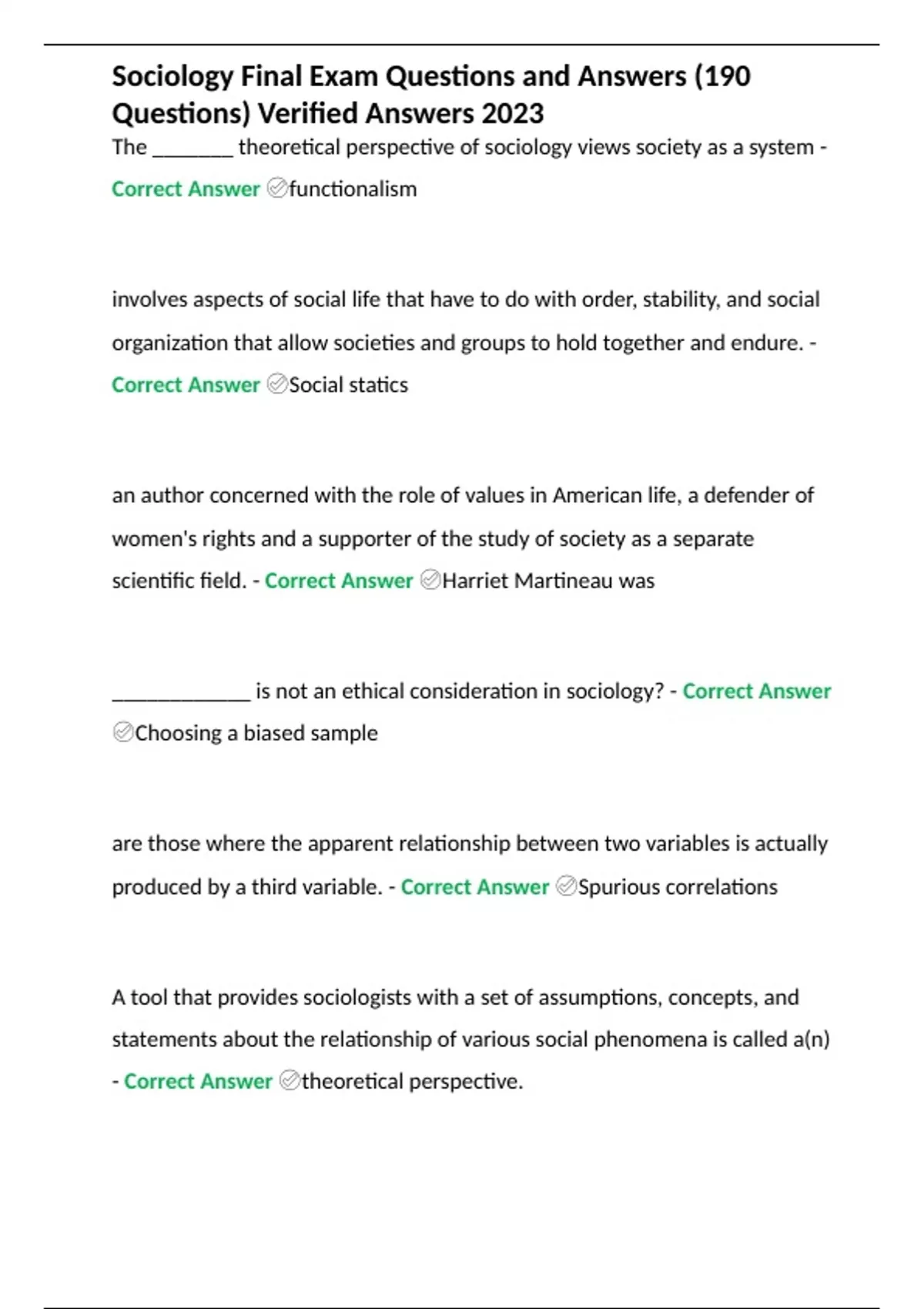 Sociology Final Exam Questions and Answers (190 Questions) Verified Answers 2023