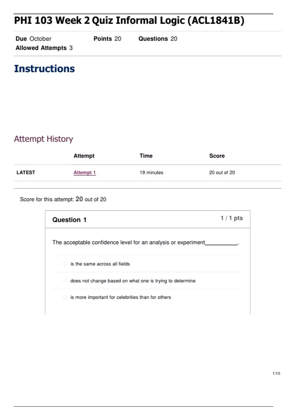 PHI 103 Week 2 Quiz Informal Logic.The acceptable confidence level for an analysis or experiment . is the same across all fields does not change based on what one is trying to determine is more important for celebrities than for others