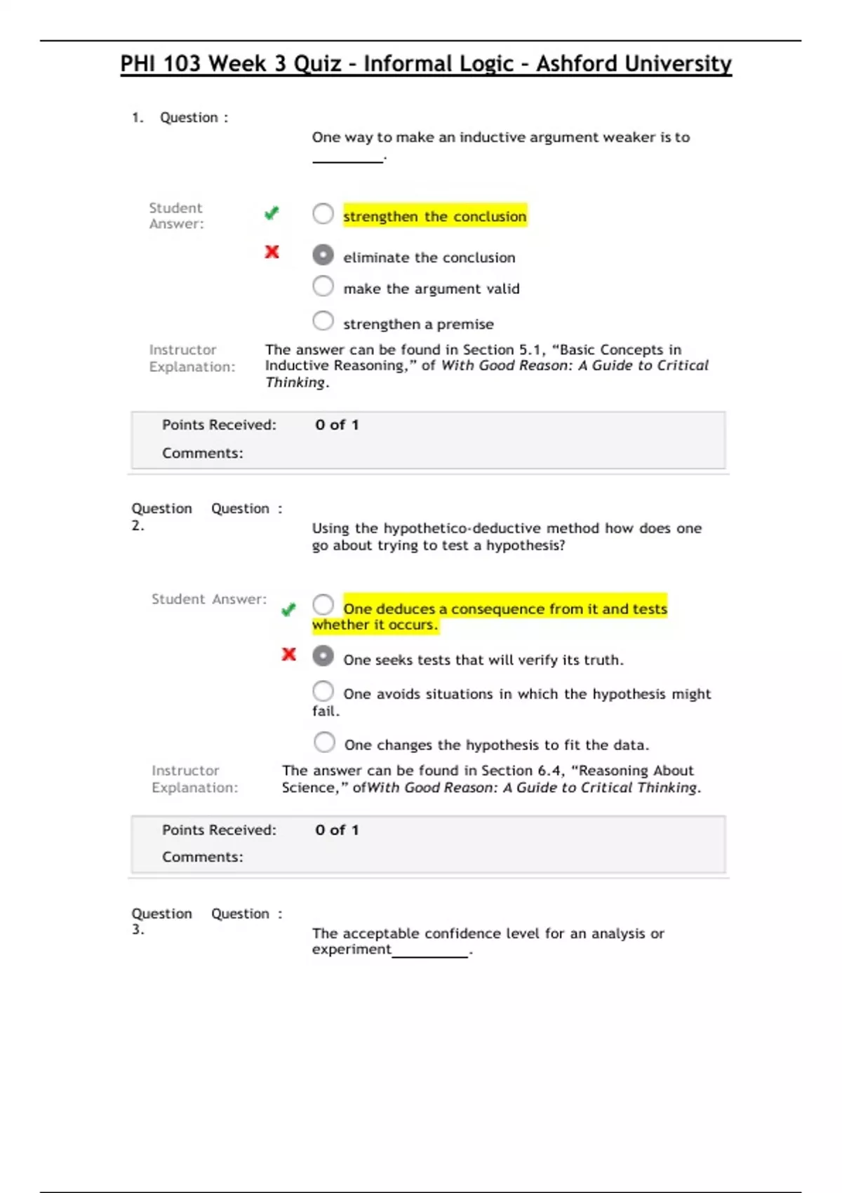 PHI 103 Week 3 Quiz – Informal Logic – Ashford University.Question : One way to make an inductive argument weaker is to . Student Answer: strengthen the conclusion eliminate the conclusion make the argument valid Instructor Explanation: strengthen a premise The answer can be found in Section 5.1, “Basic Concepts in Inductive Reasoning,” of With Good Reason: A Guide to Critical Thinking. Question 2. Question : Using the hypothetico-deductive method how does one go about trying to test a hypothesis?