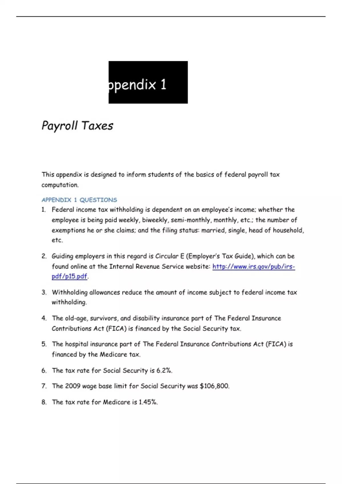 This appendix is designed to inform students of the basics of federal payroll tax