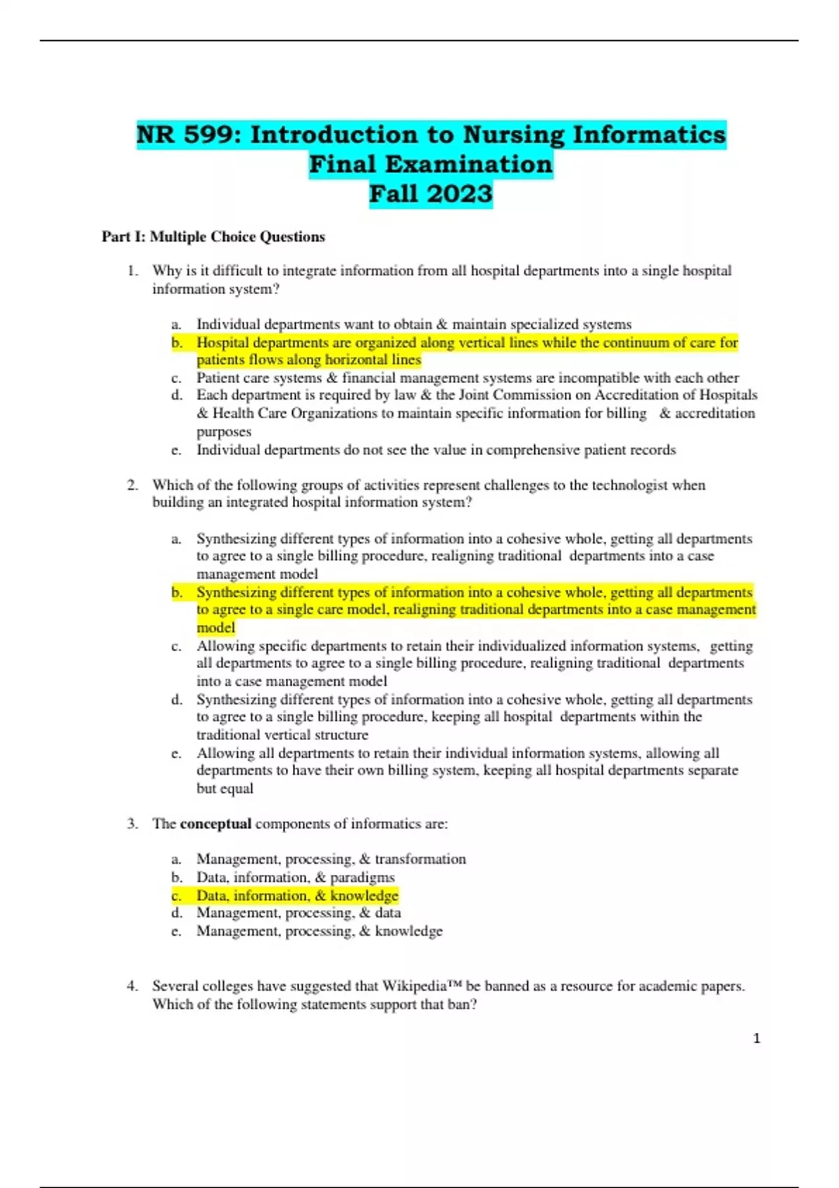NR 599: Introduction to Nursing Informatics Final Examination Fall 2023
