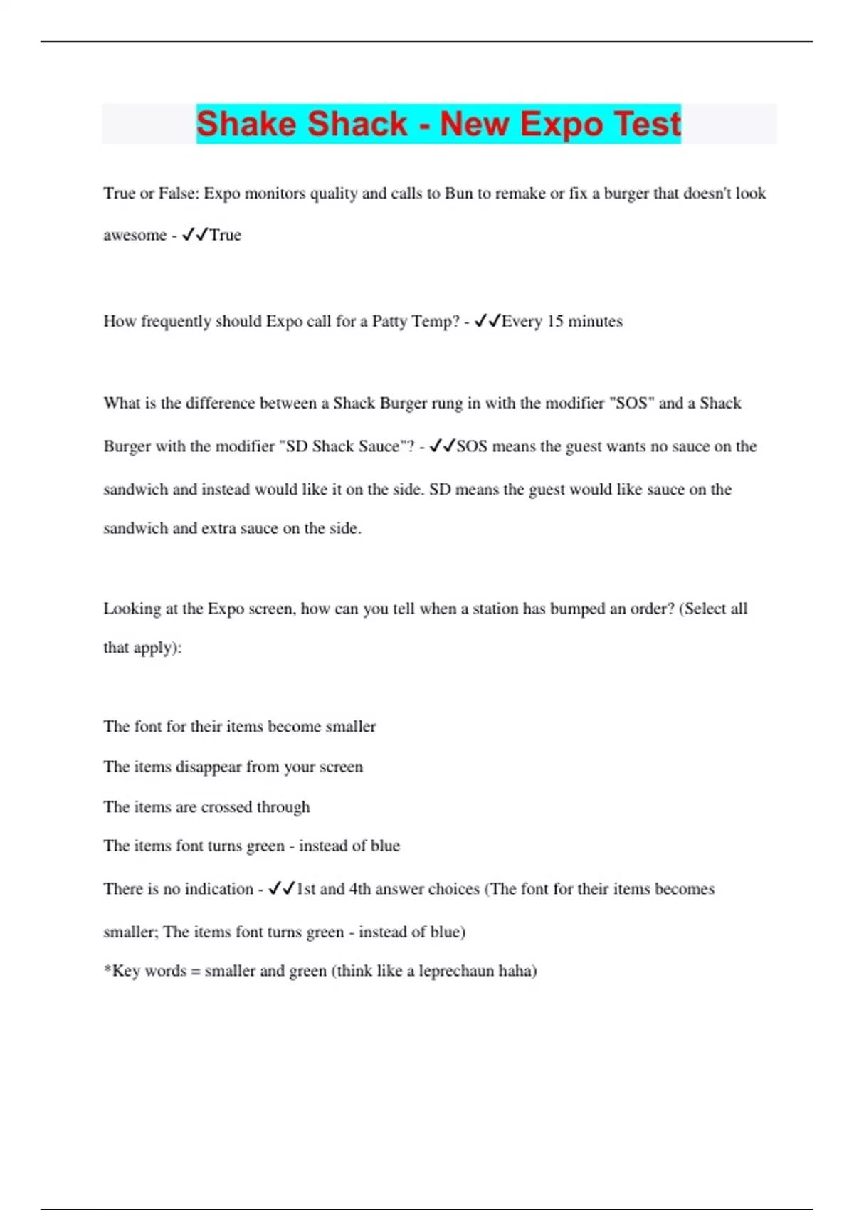 True or False: Expo monitors quality and calls to Bun to remake or fix a burger that doesn't look awesome - True How frequently should Expo call for a Patty Temp? - Every 15 minutes What is the difference between a Shack Burger rung in with the modifier "SOS" and a Shack Burger with the modifier "SD Shack Sauce"? - SOS means the guest wants no sauce on the sandwich and instead would like it on the side. SD means the guest would like sauce on the sandwich and extra sauce on the side. Looking at the Expo screen, how can you tell when a station has bumped an order? (Select all that apply): The font for their items become smaller
